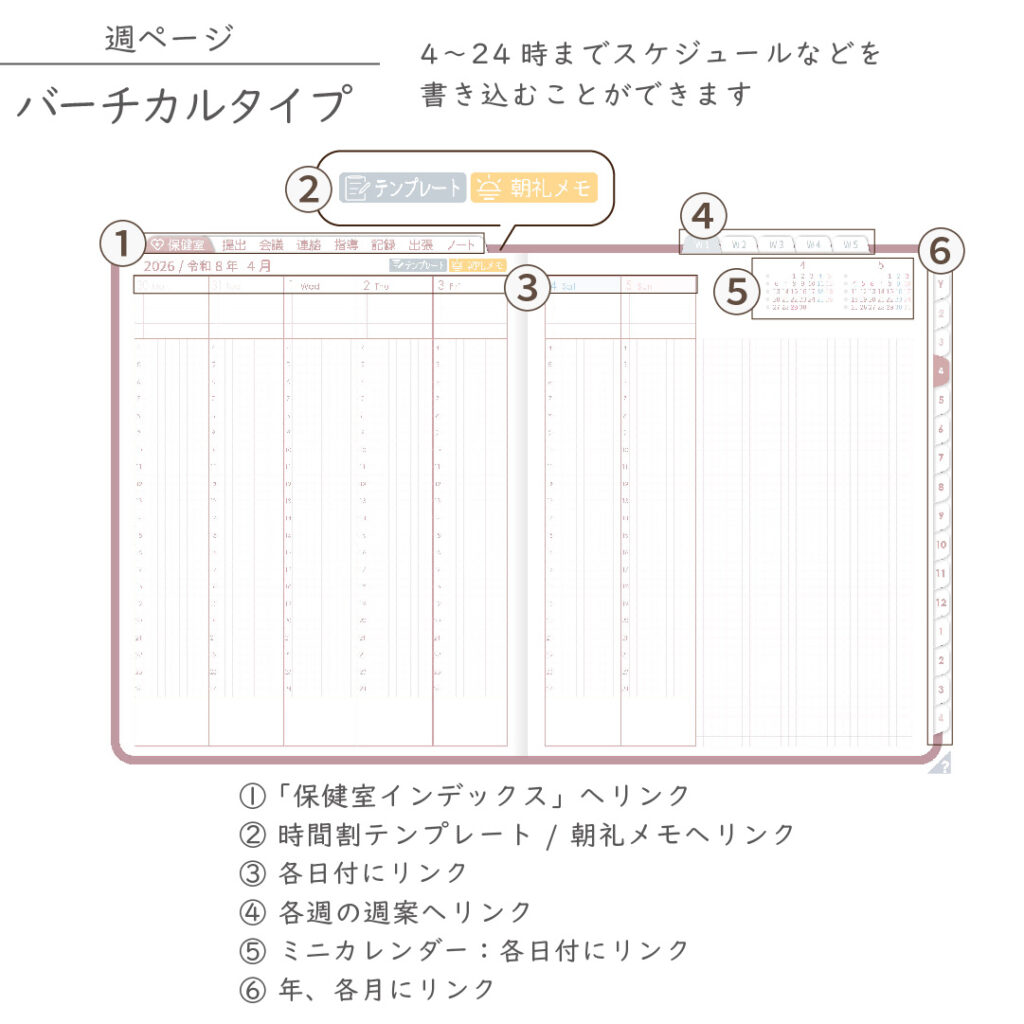 ✔ バーチカルタイプ:4時~24時の時間軸で予定管理が可能。