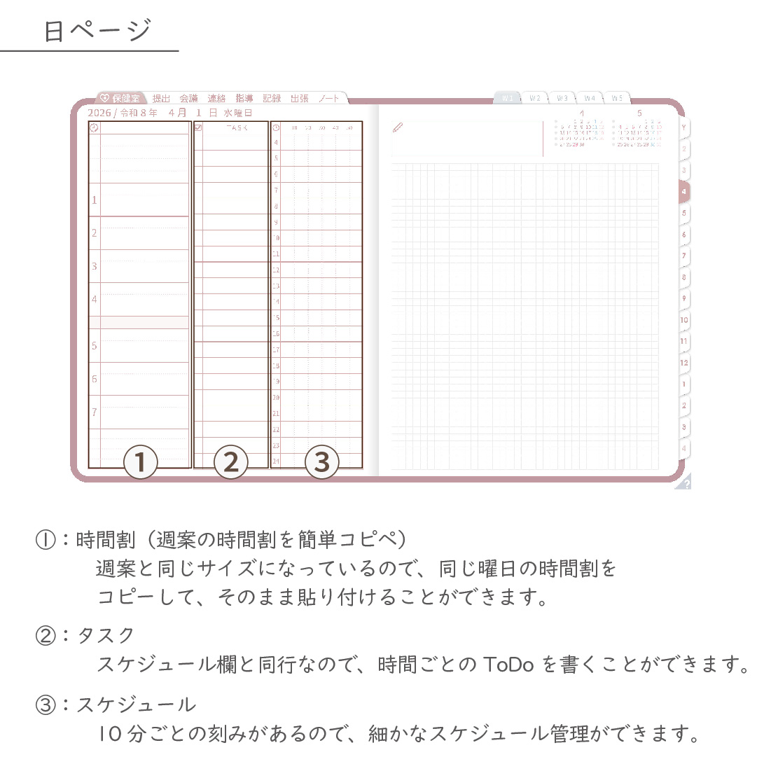 ✔ 週案タイプ:学校の時間割形式で、授業時間と連動できます。