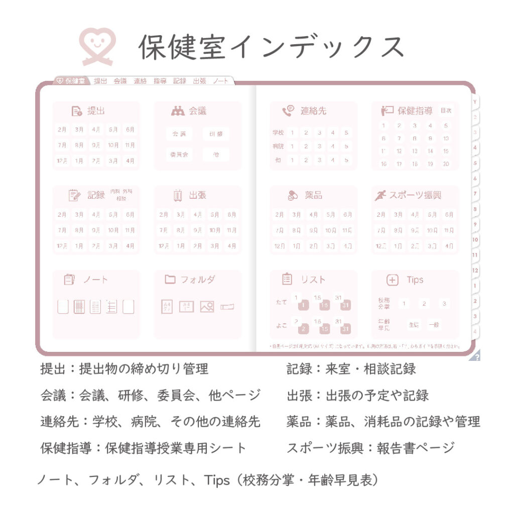 保健室業務に必要な各種業務シートを多数用意し、これ一冊でスケジュール管理から保健室業務の効率化まで対応できます。