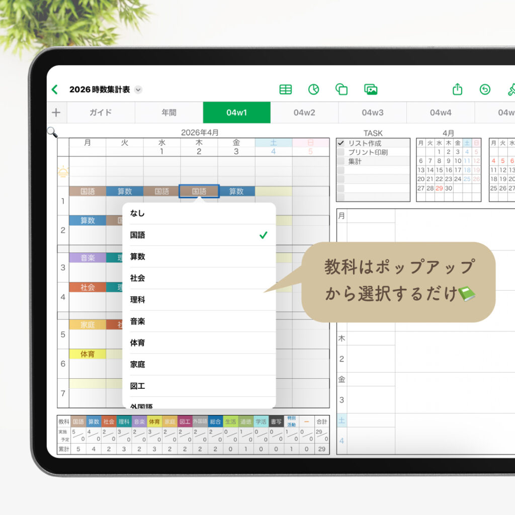 ・週案から教科を選ぶだけで時数が集計されます。