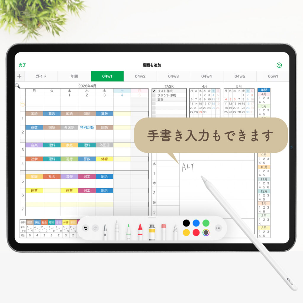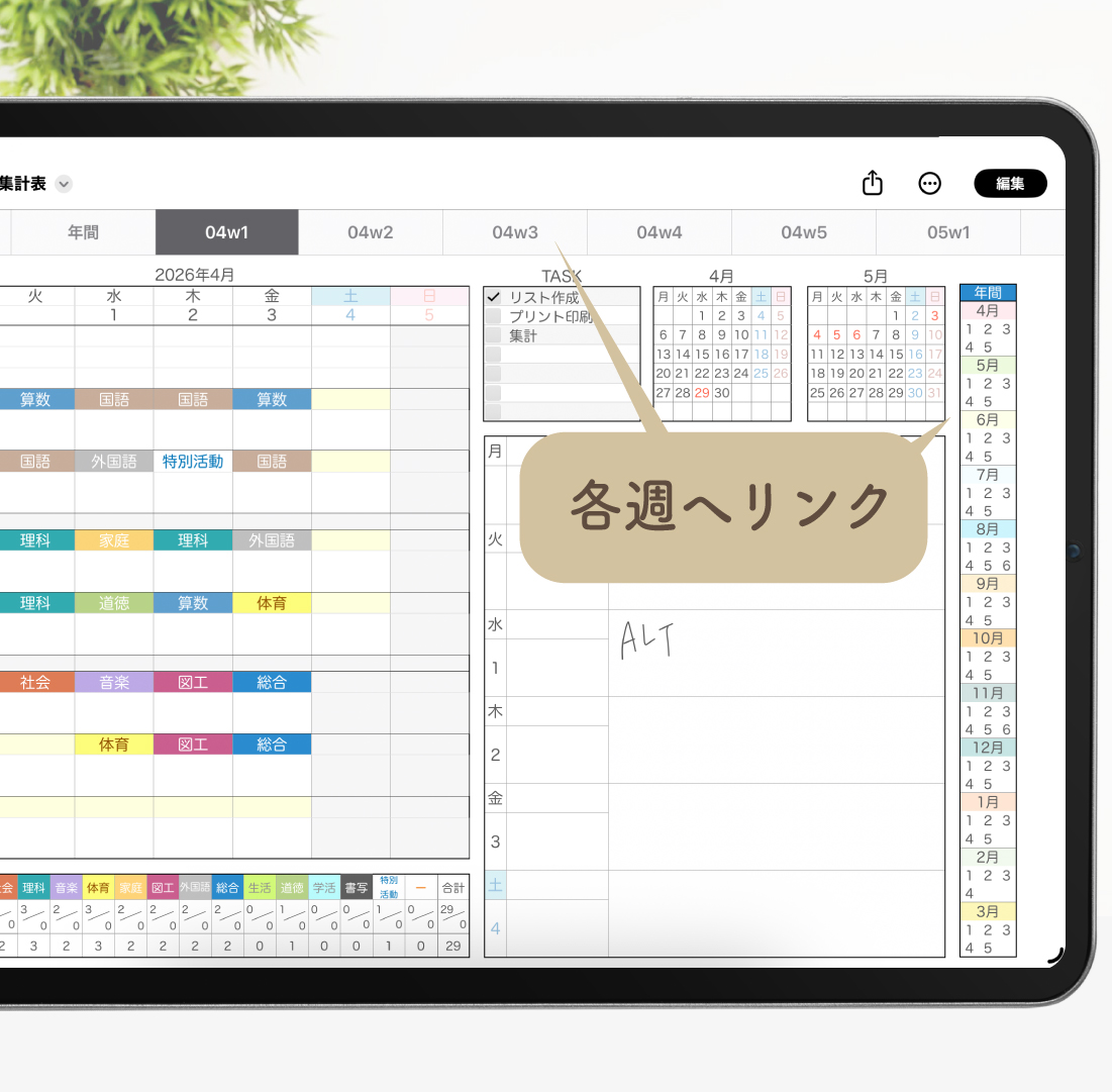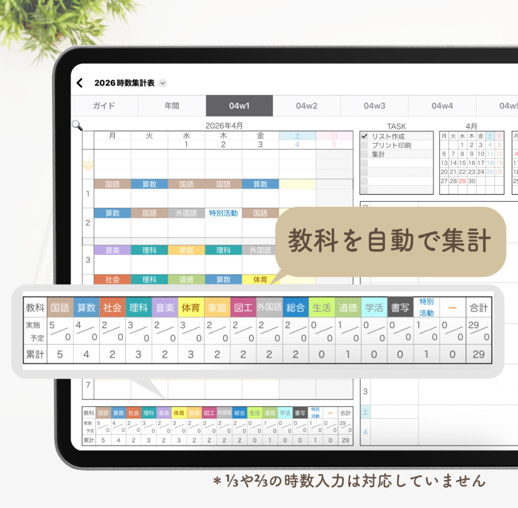 ・年間ページでは、年間に加え月ごとの時数も自動計算されます。