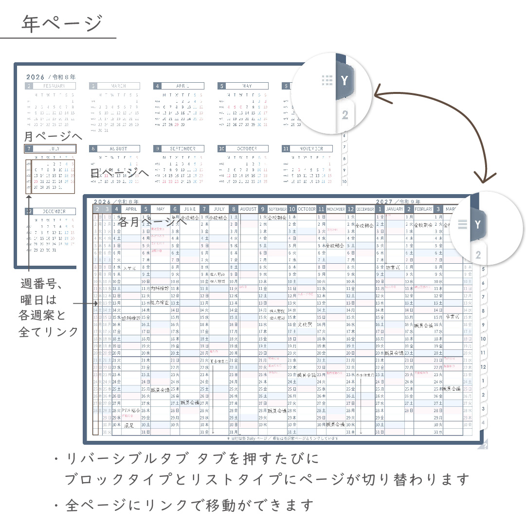 ・年間・月間ページ(※1)はそれぞれリバーシブルで2種類のページを簡単切り替え