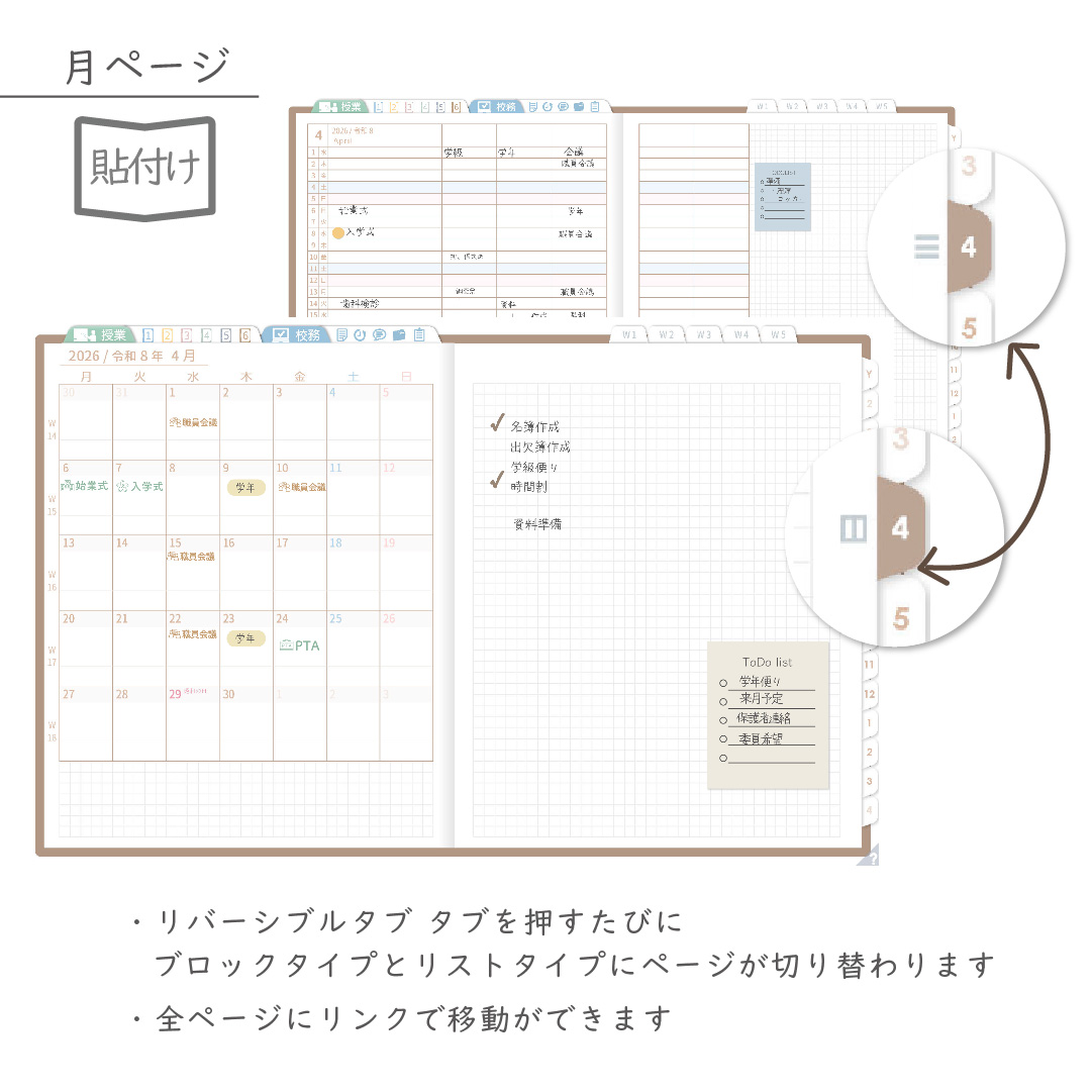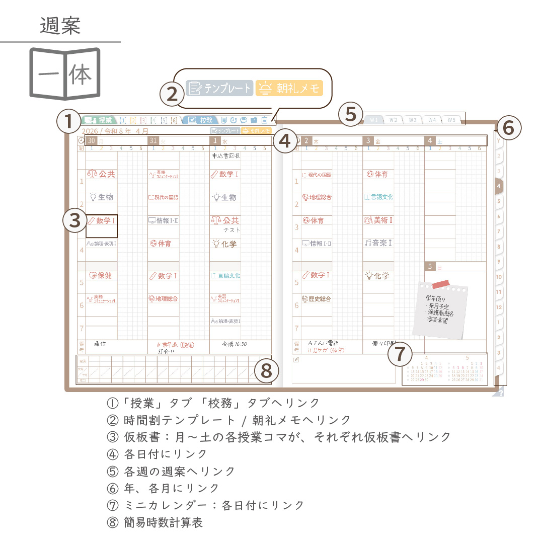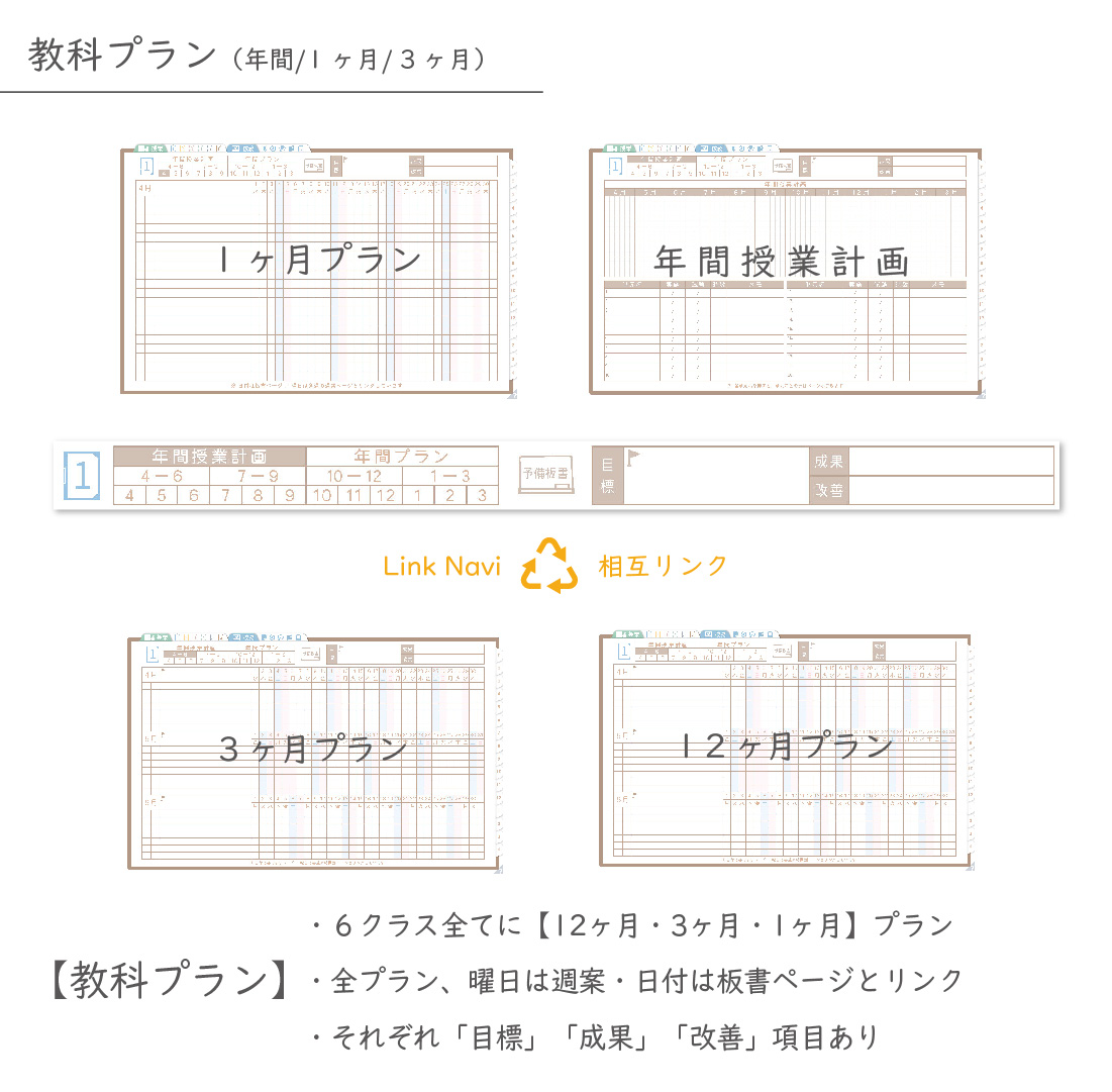 教員向け手帳として、週案を軸に年月日の全スケジュールと授業に役立つ6クラス分の年間・月間授業計画と連動した板書ページ。