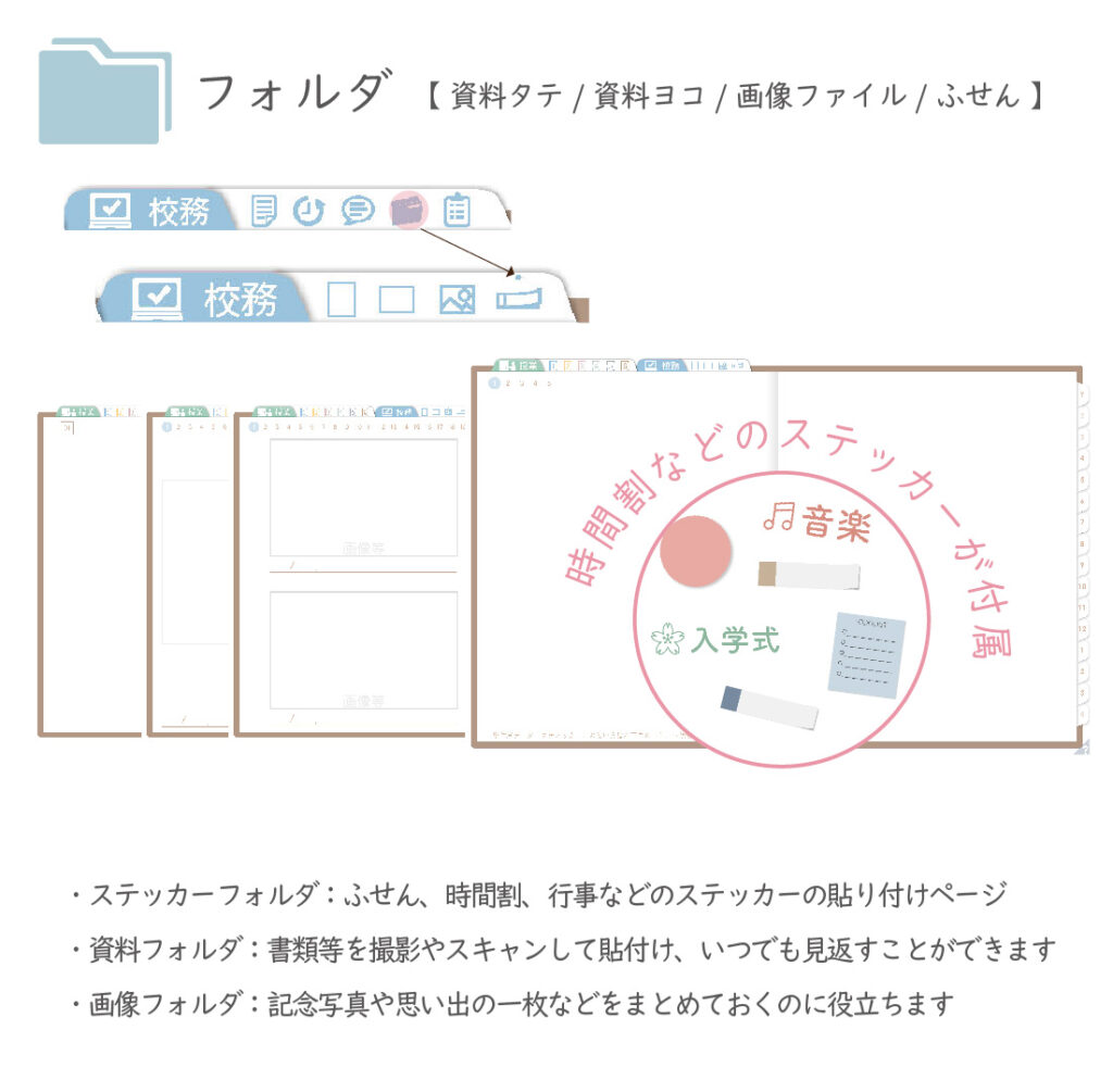さらに校務管理に使えるプロジェクトシート、会議録、朝礼メモの他、ノートや資料フォルダなど、これ一つで教員の予定・授業・校務管理がオールインワンになった手帳です。