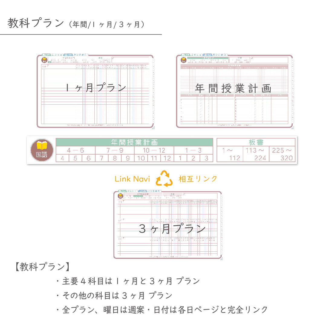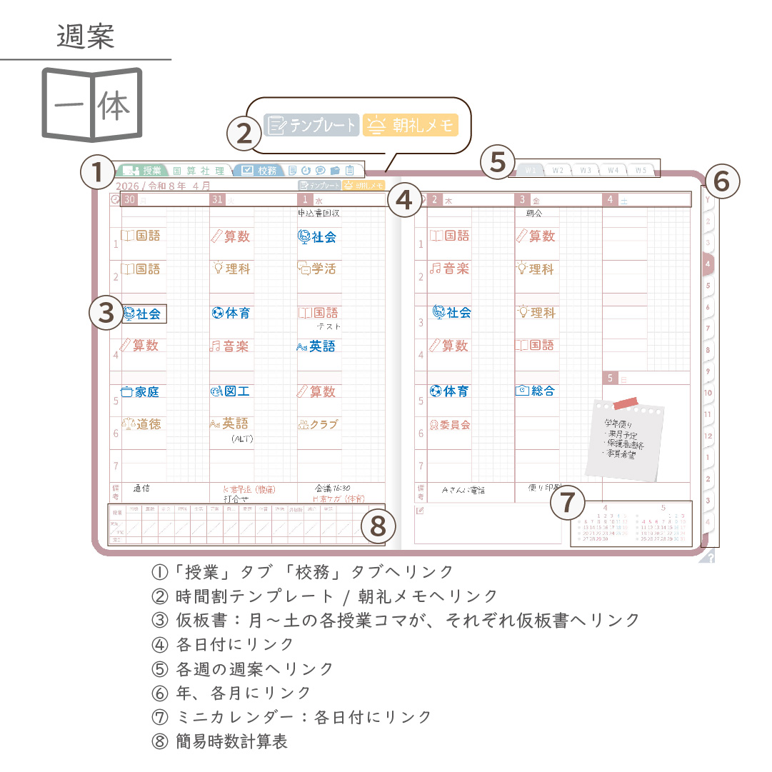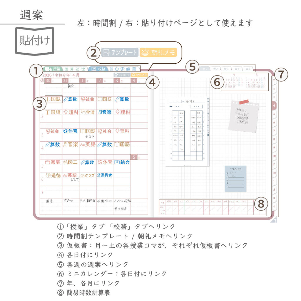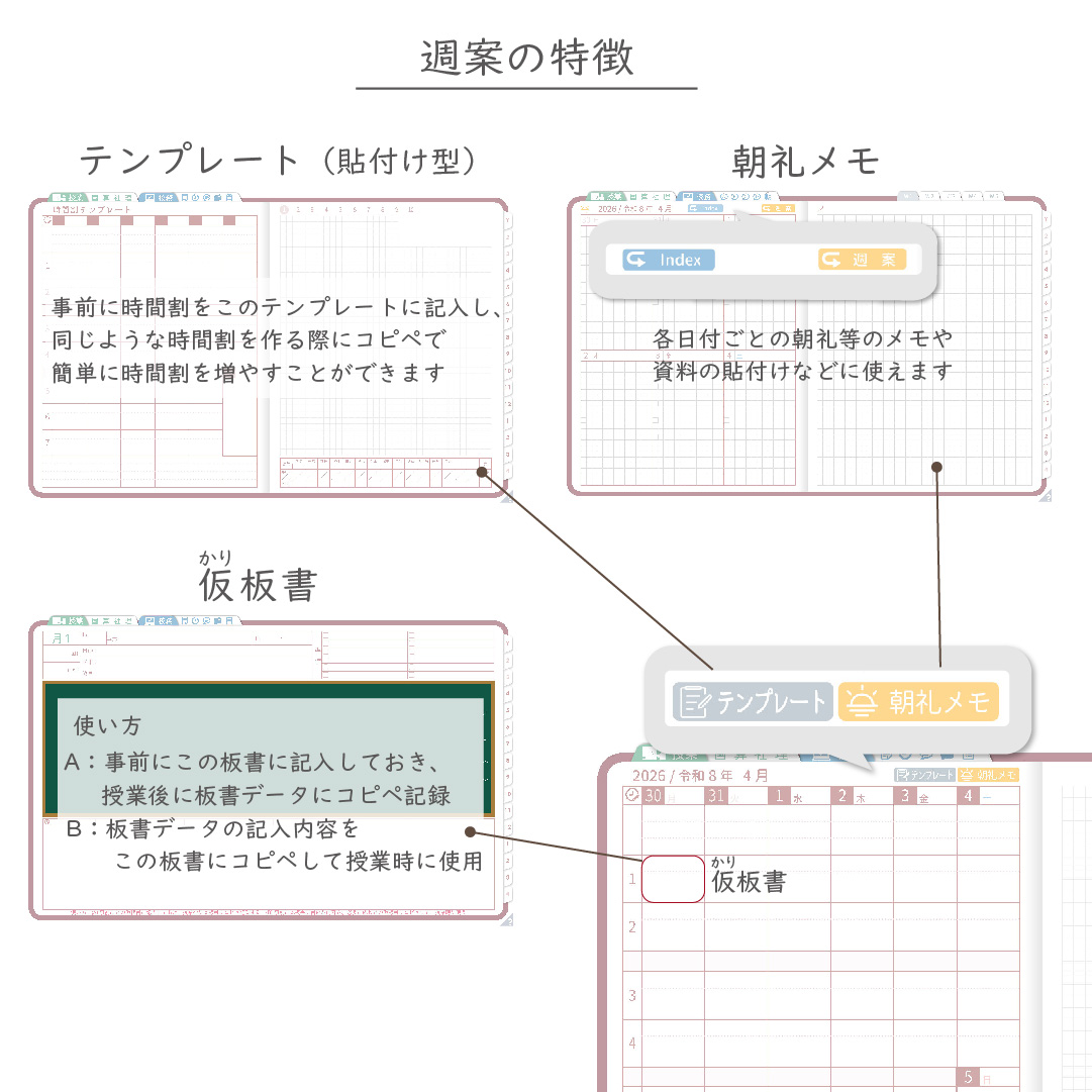 ・週案(※2)は3タイプから選べ、板書ページがリンクで直ぐに開けます