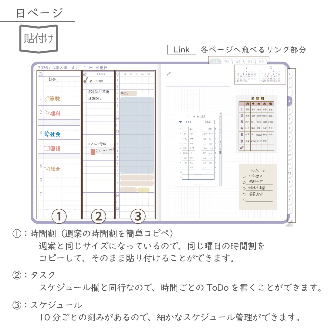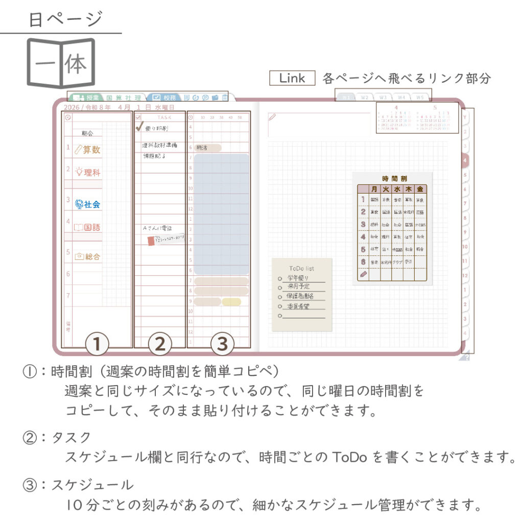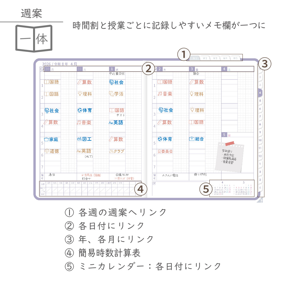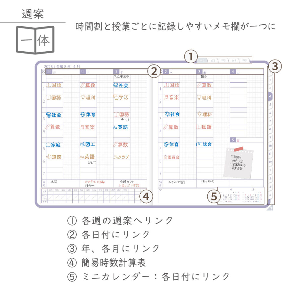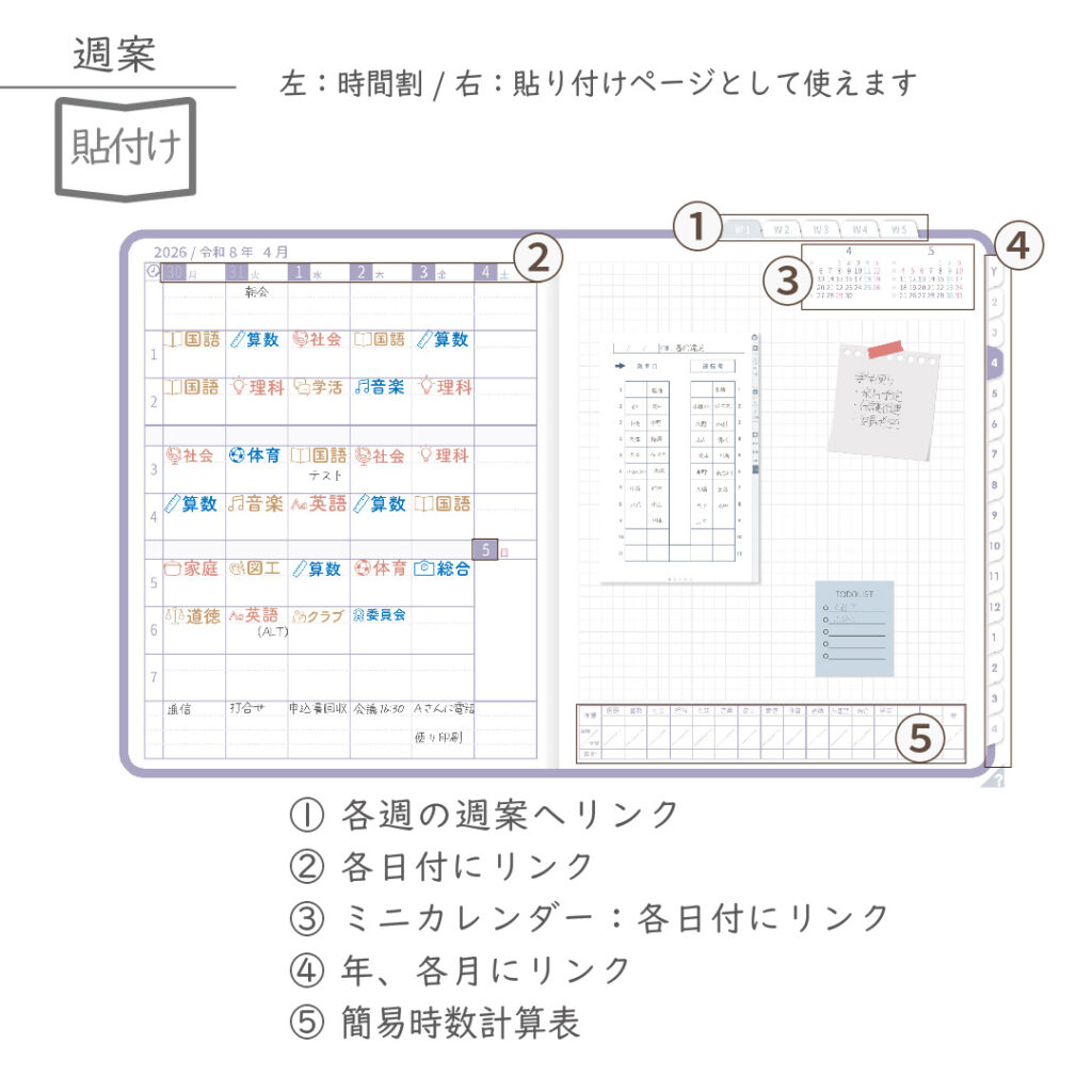 ・週案(※2)は3タイプから選べ、板書ページがリンクで直ぐに開けます