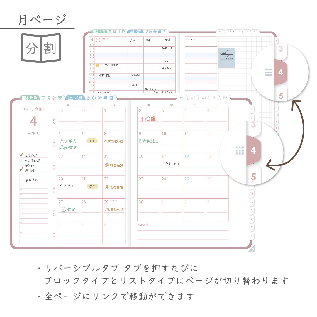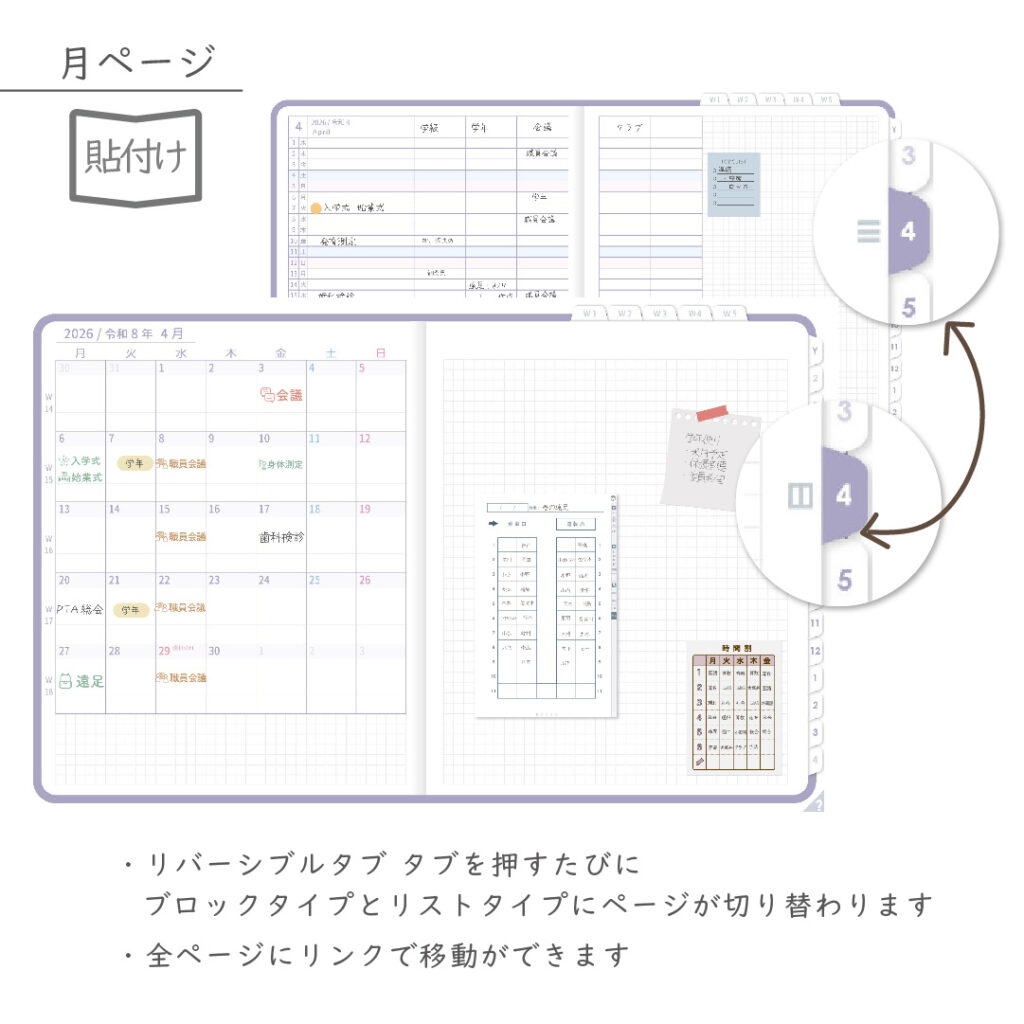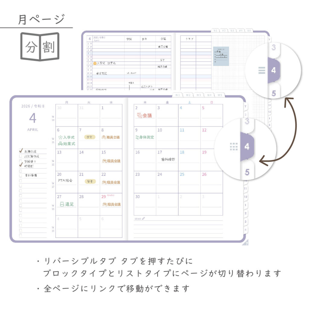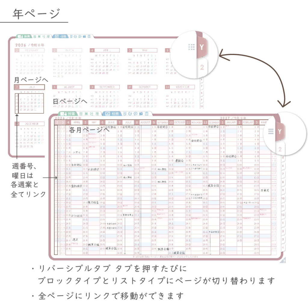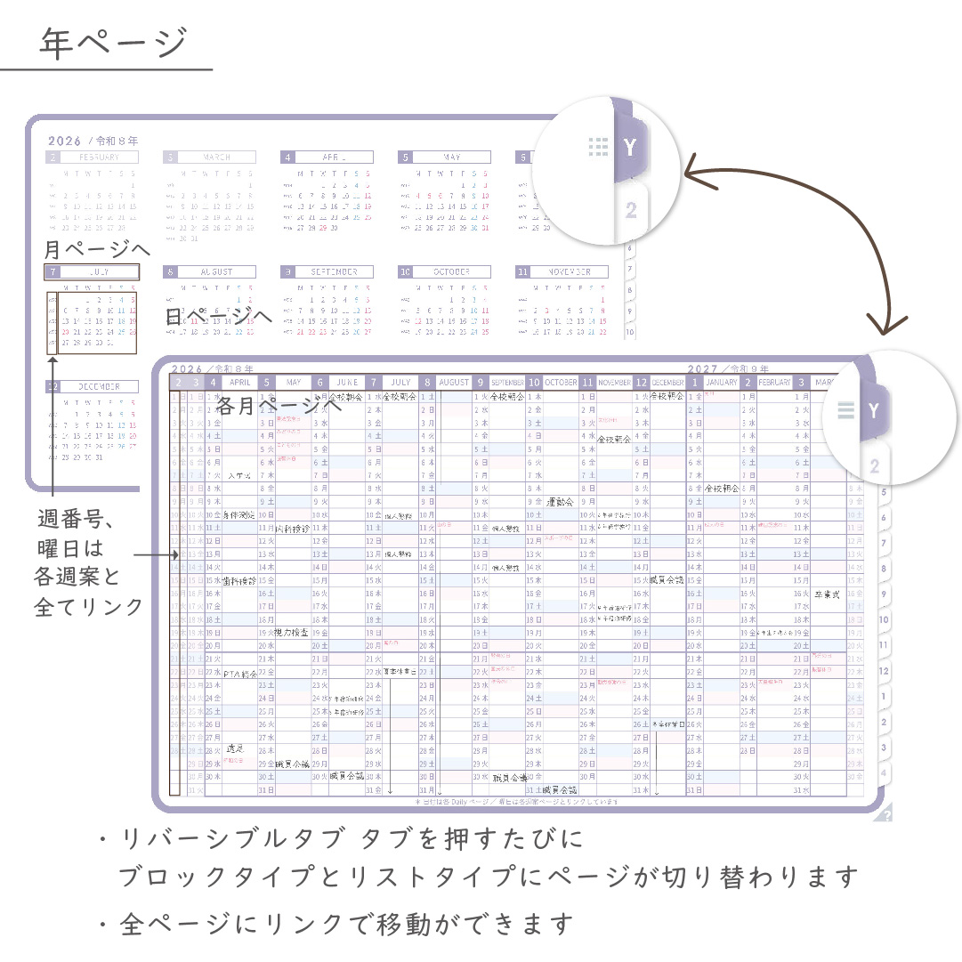 ・年間・月間ページ(※1)はそれぞれリバーシブルで2種類のページを簡単切り替え