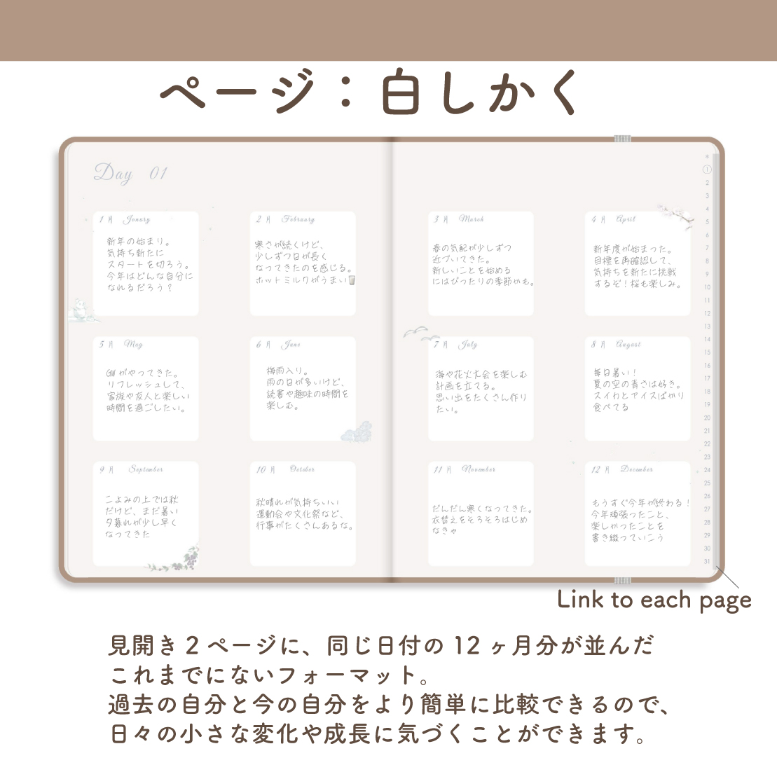 1年分の「今日」を並べて見ることで、過去の自分と今の自分をやさしく比べられ、