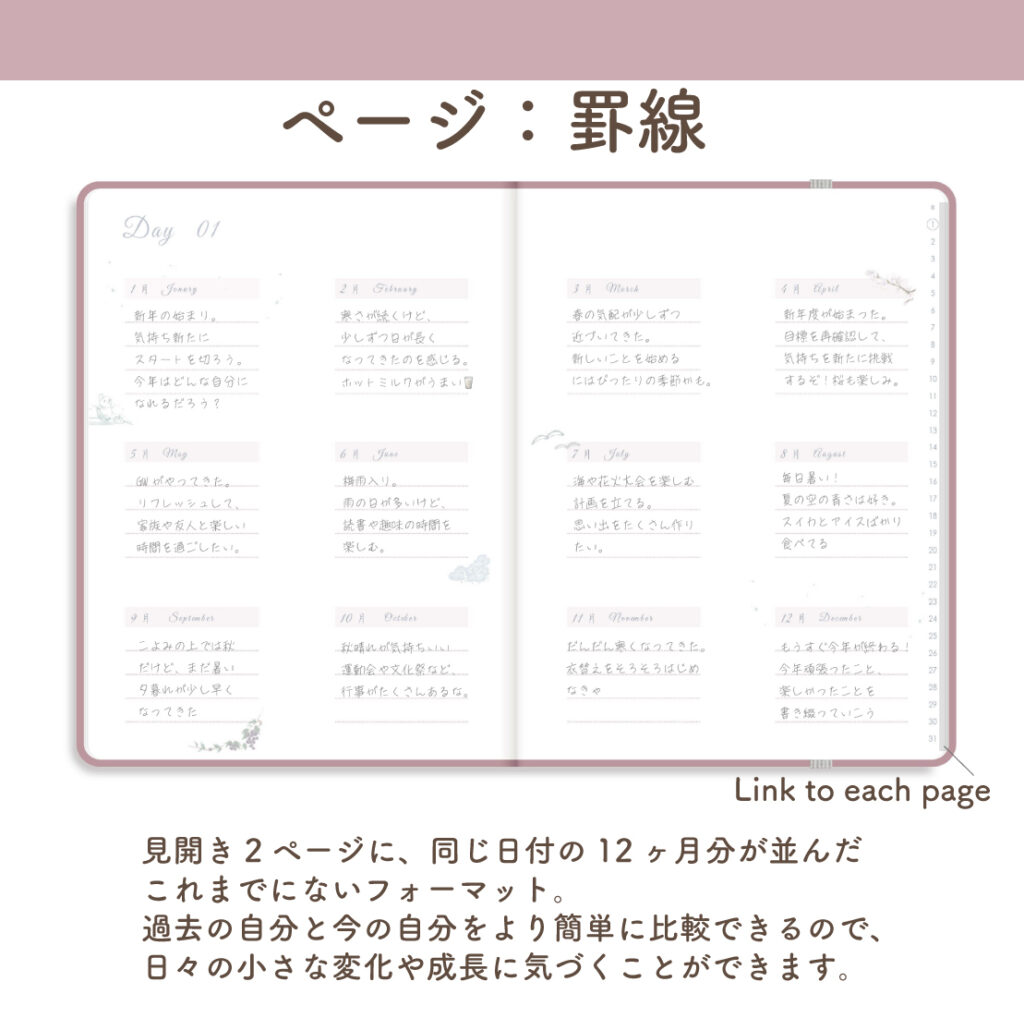 同じ日付の記録を12ヶ月分、見開きで並べて書ける万年タイプのデジタル手帳です。