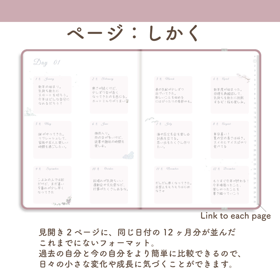 同じ日付の記録を12ヶ月分、見開きで並べて書ける万年タイプのデジタル手帳です。