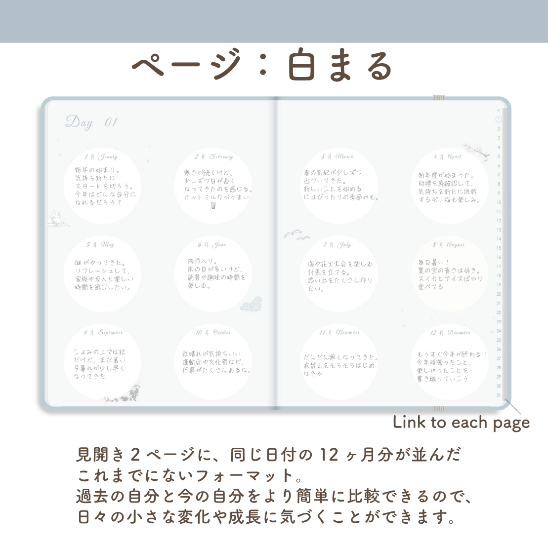 同じ日付の記録を12ヶ月分、見開きで並べて書ける万年タイプのデジタル手帳です。