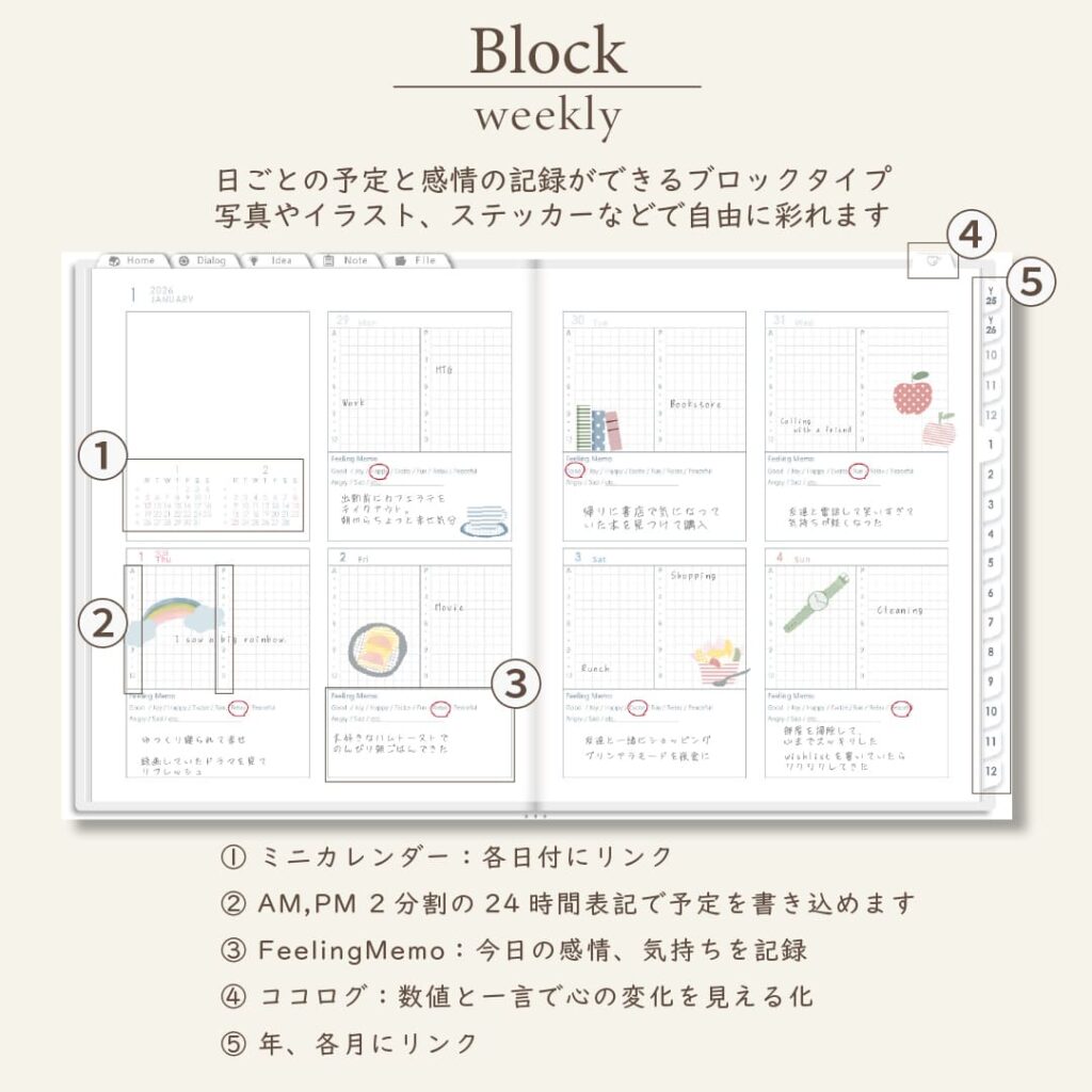 - 年・月ページは「ブロック」と「リスト」がリバーシブル