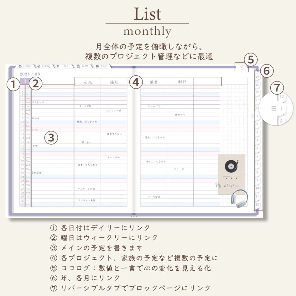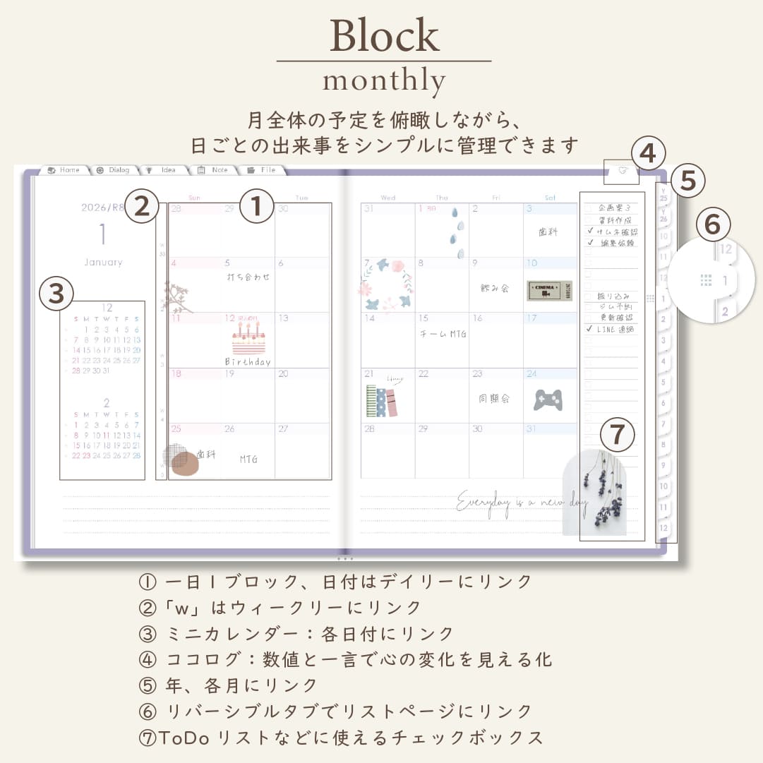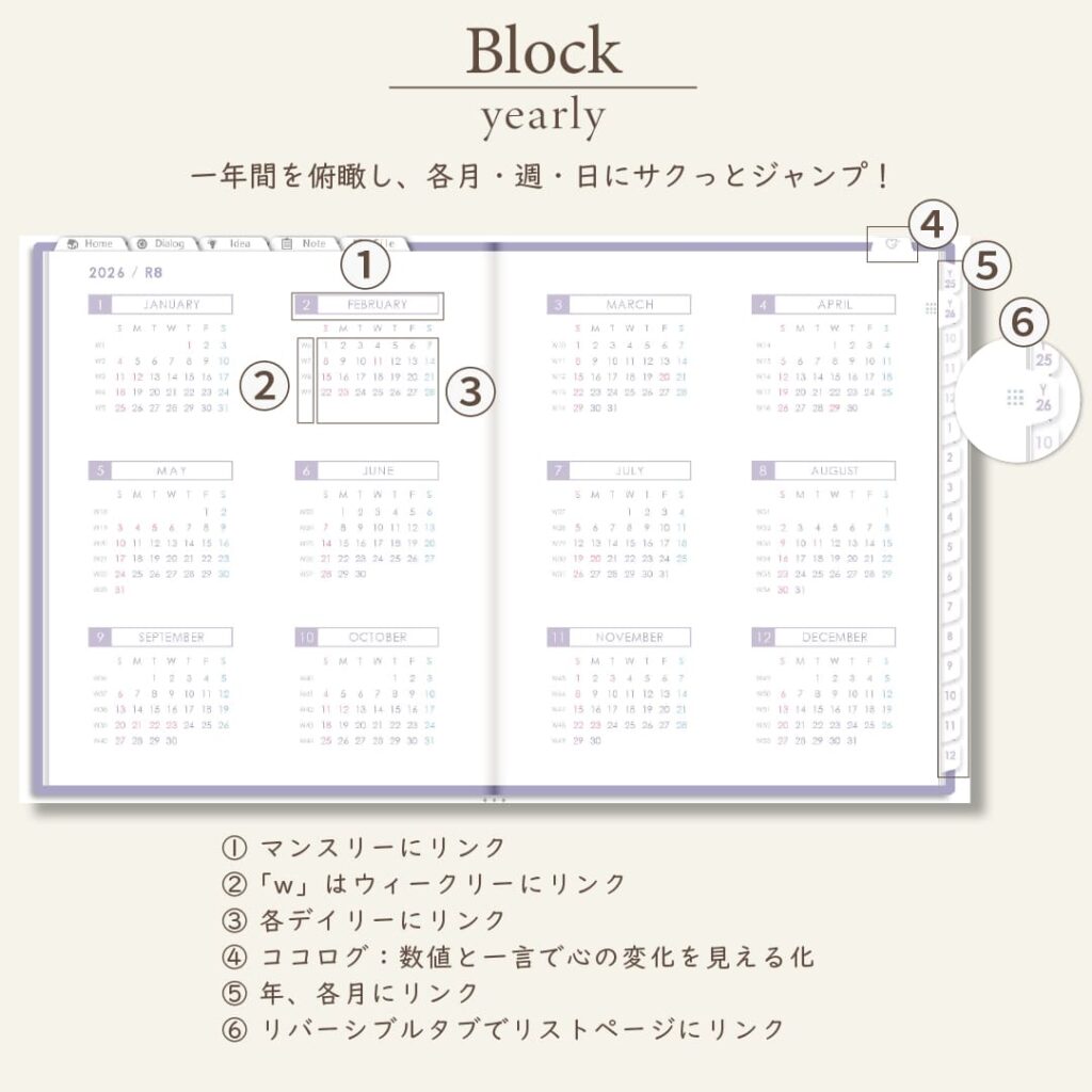 - 年・月ページは「ブロック」と「リスト」がリバーシブル
