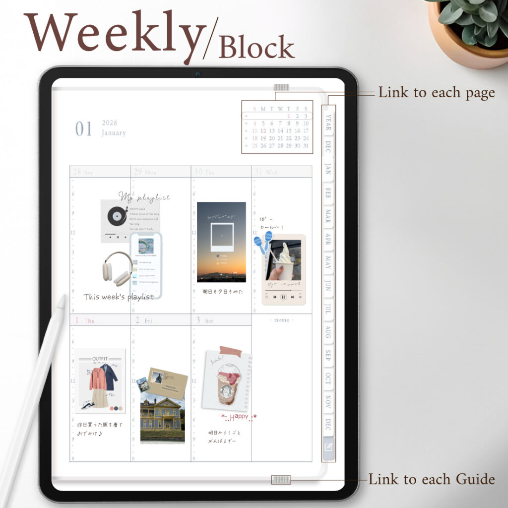 ・日付はDay、曜日はWeekにリンクしているので、どのページからも行き来し、チェックが簡単。