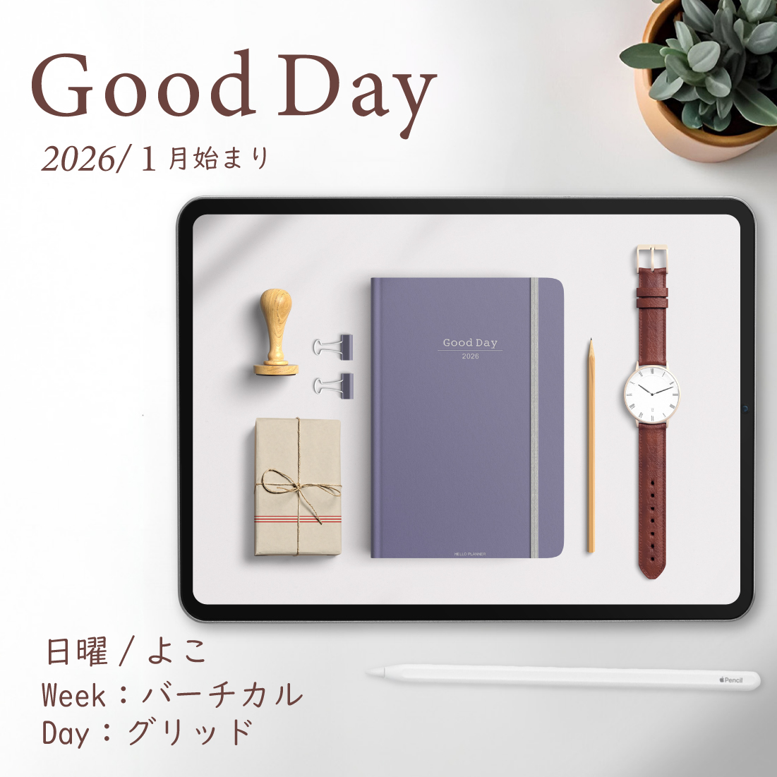 2026年1月始まり「Good Day」横タイプ[日曜始まり/週:バーチカル/日:グリッド/色:スミレ]