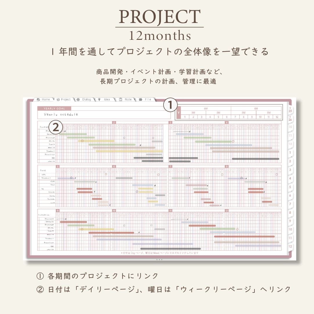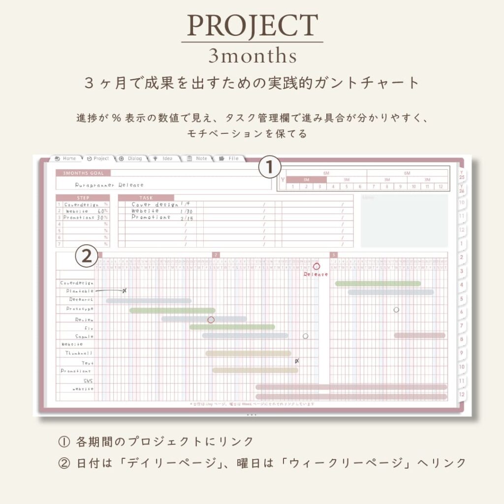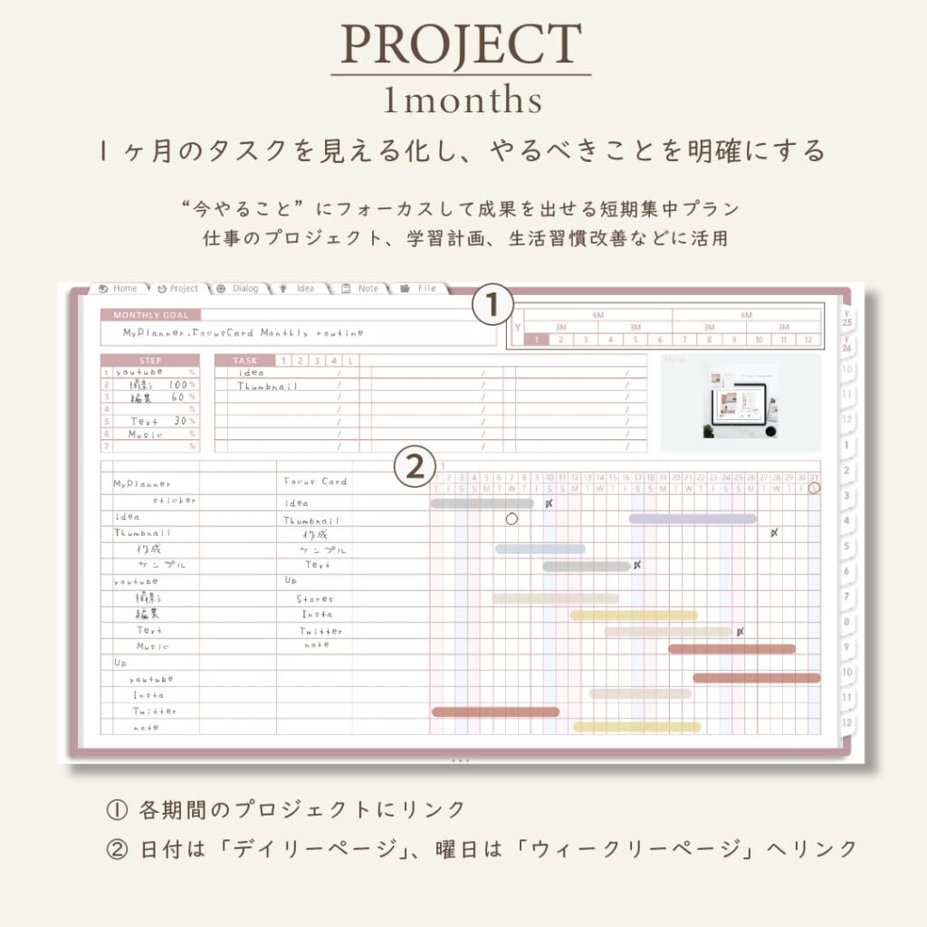 - 1年・半年・3ヶ月・1ヶ月のガントチャートで進捗を見える化