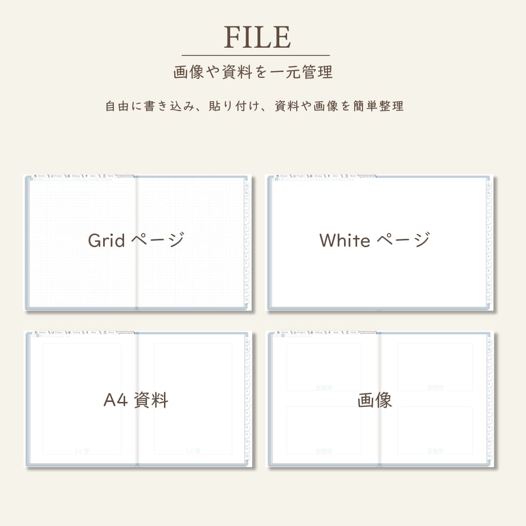 - 5種類×各100ページのノート、ファイルページ付き