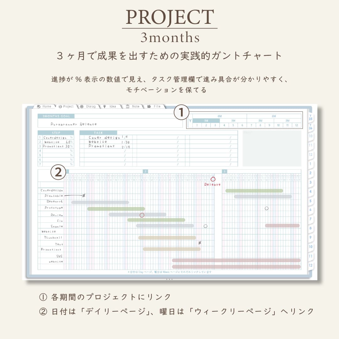 - 1年・半年・3ヶ月・1ヶ月のガントチャートで進捗を見える化