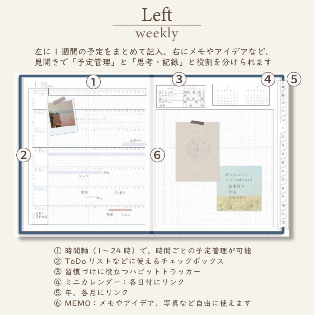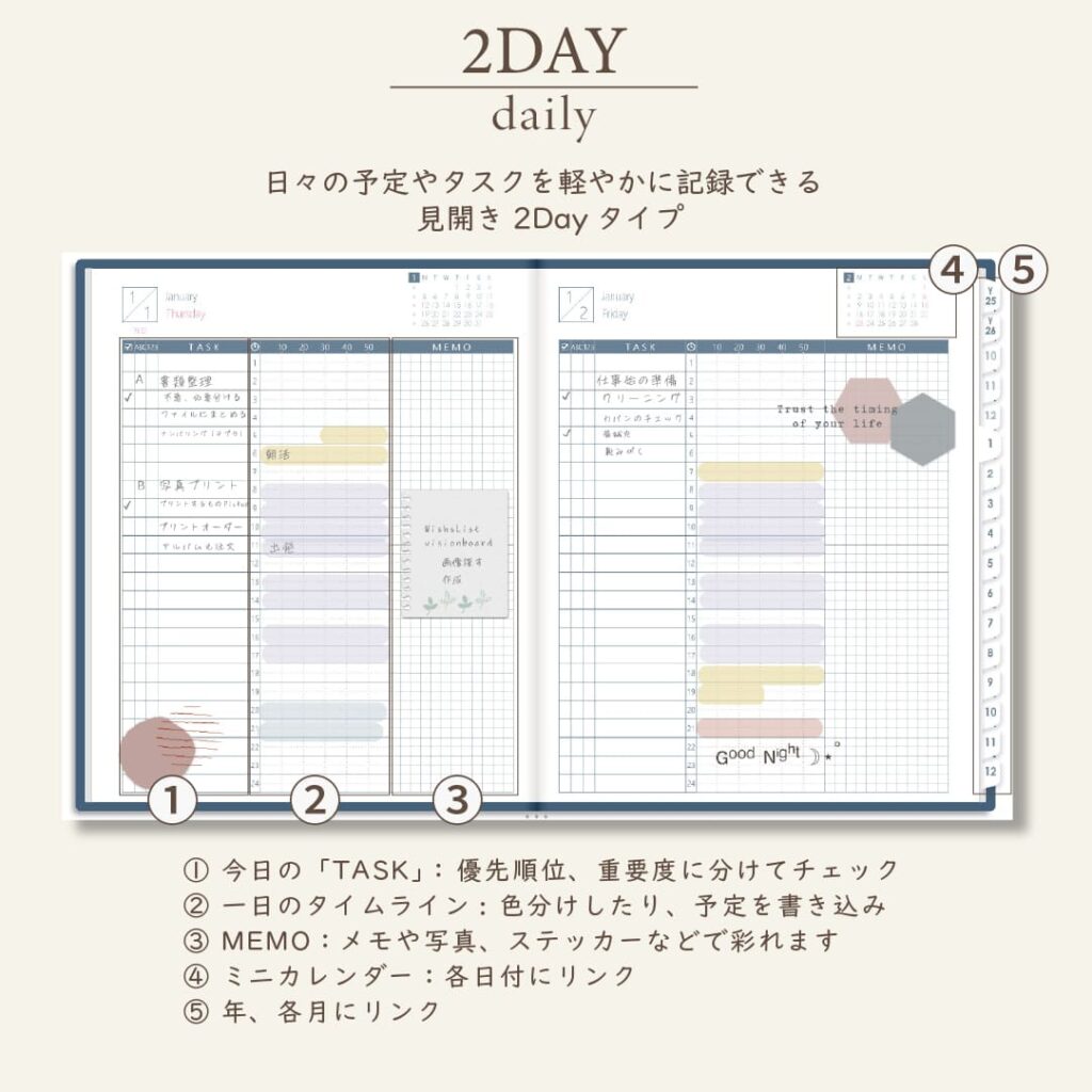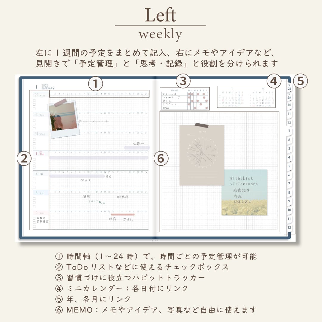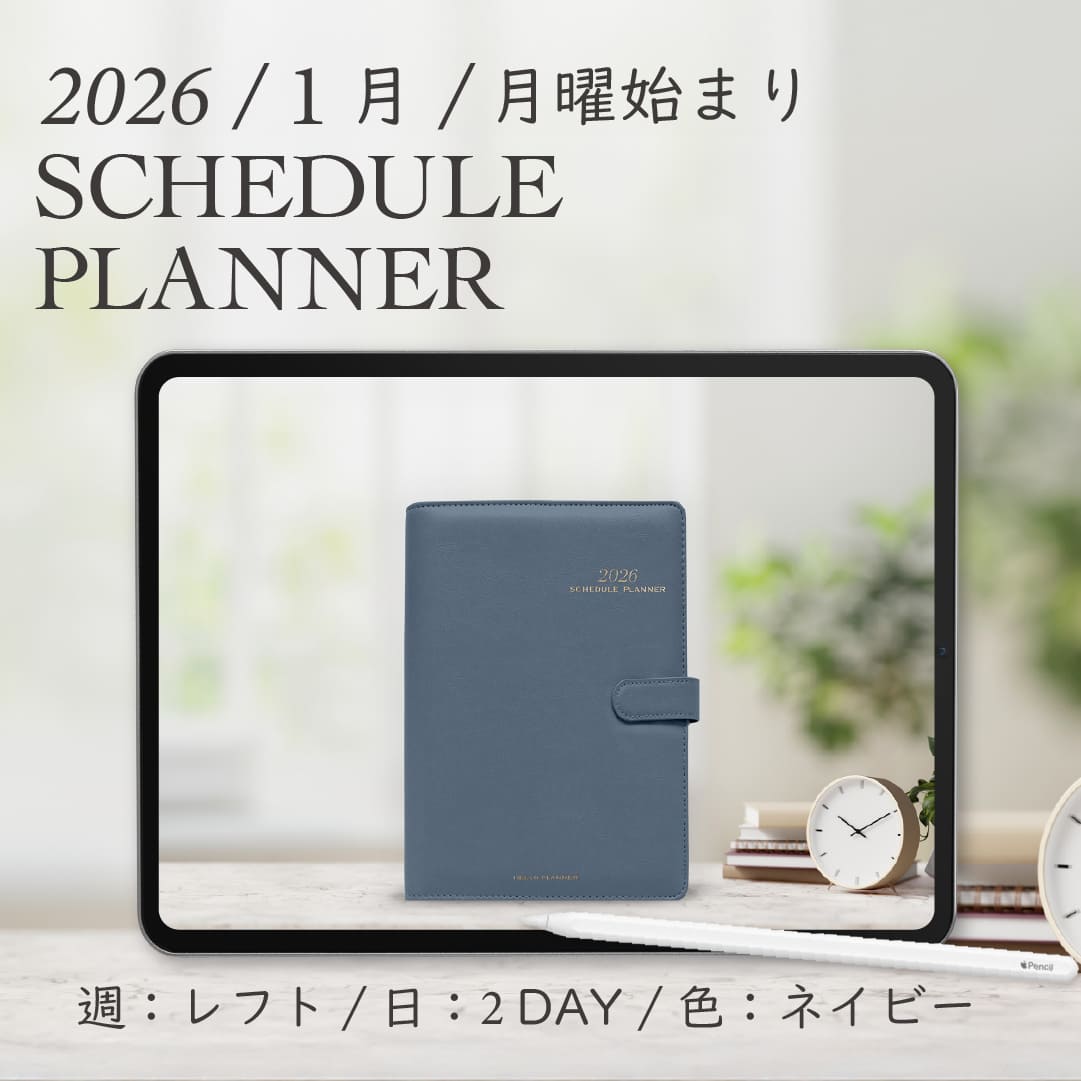 2026年1月始まりスケジュールプランナー[月曜始まり/週:レフト/日:2DAY/色:ネイビー]