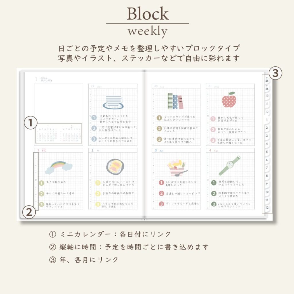 2026年1月始まりスケジュールプランナー[月曜始まり/週:ブロック/日:2DAY/色:スノー]