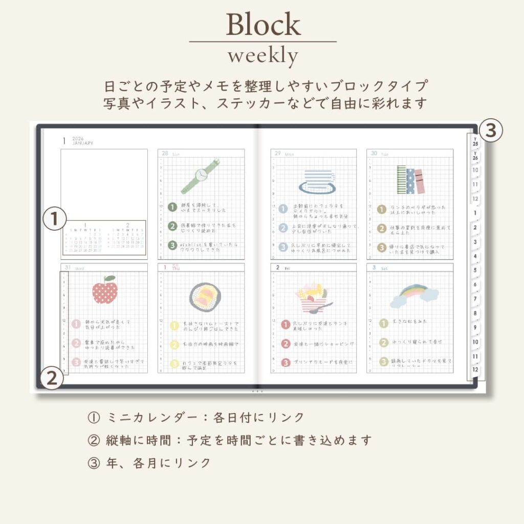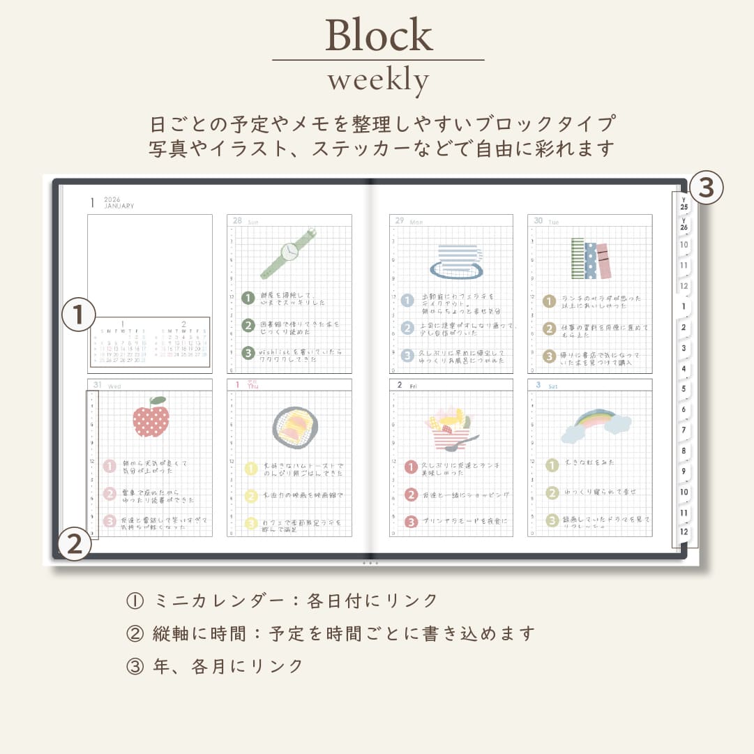 2026年1月始まりスケジュールプランナー[日曜始まり/週:ブロック/日:1DAY/色:モノ]