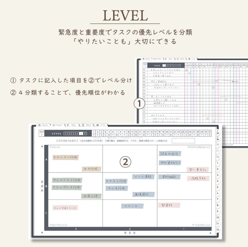 ・タスクを「重要度×優先度」で整理できるレベルシート