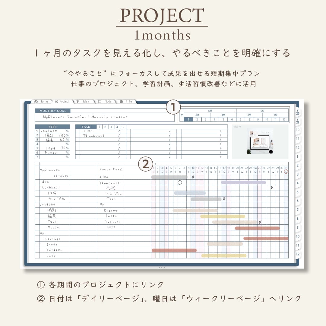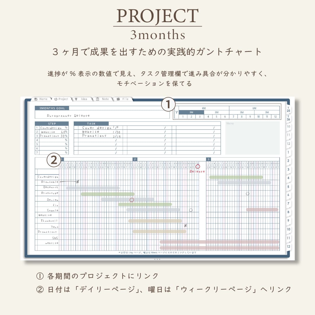 ・1年/半年/3ヶ月/1ヶ月を見渡せるガントチャート
