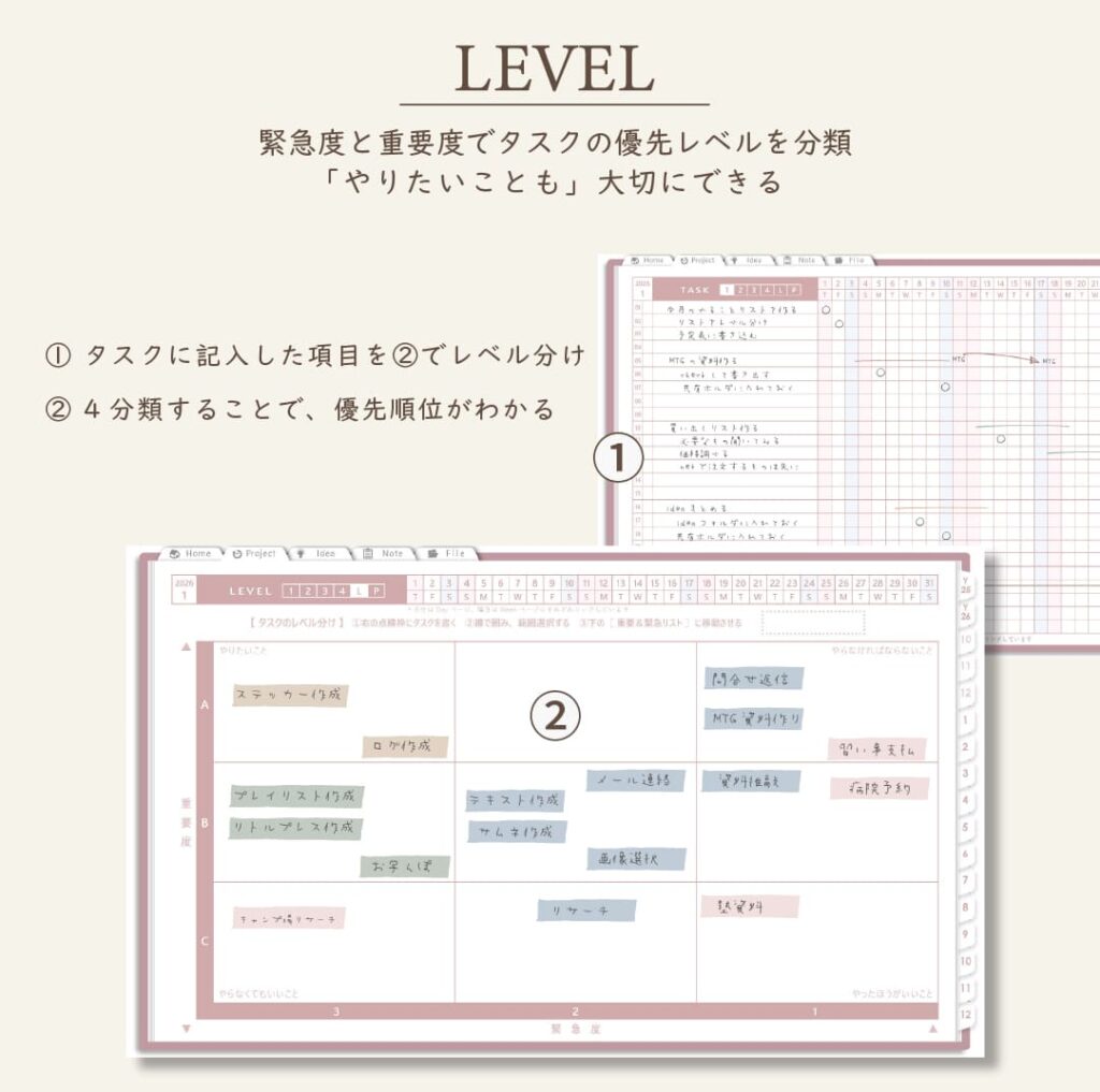 ・タスクを「重要度×優先度」で整理できるレベルシート