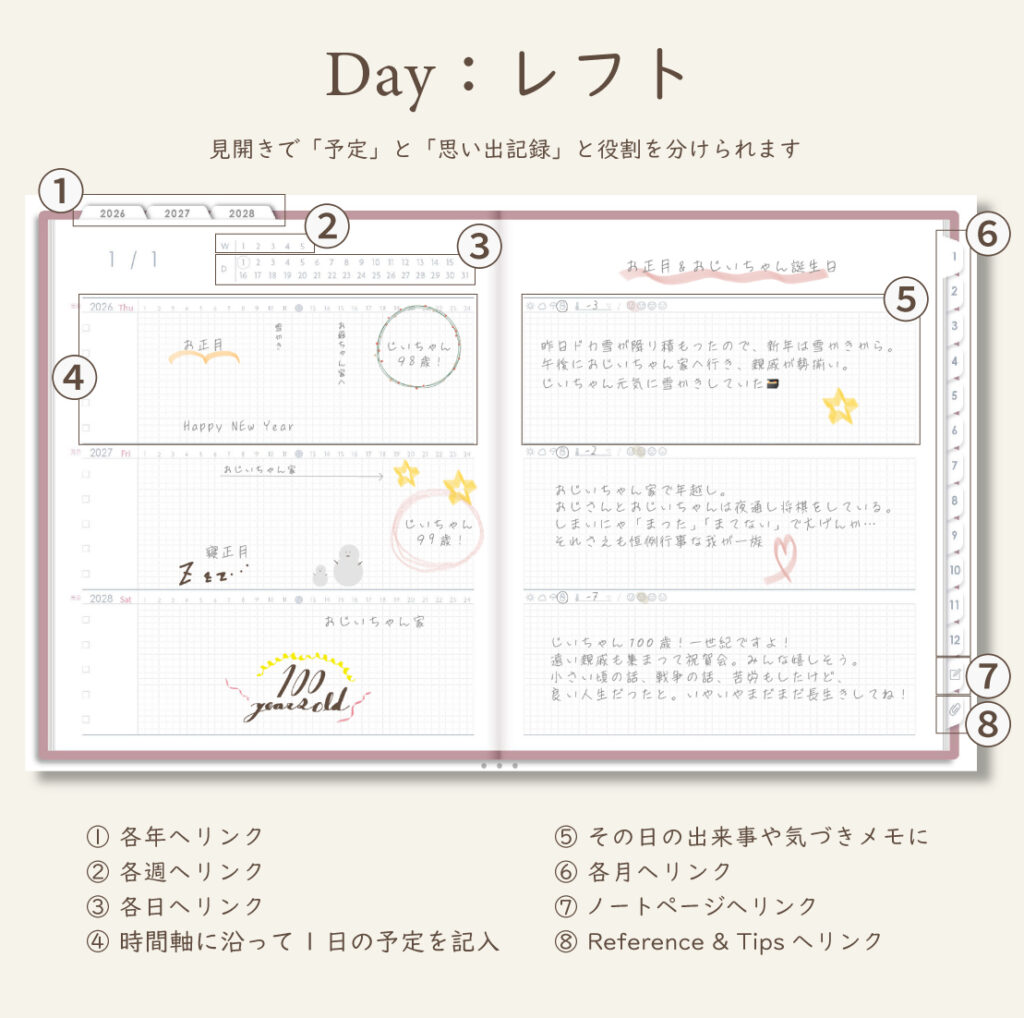 日々の予定も、ふとした出来事も、3年間ひとつの手帳に積み重ねて残せます。