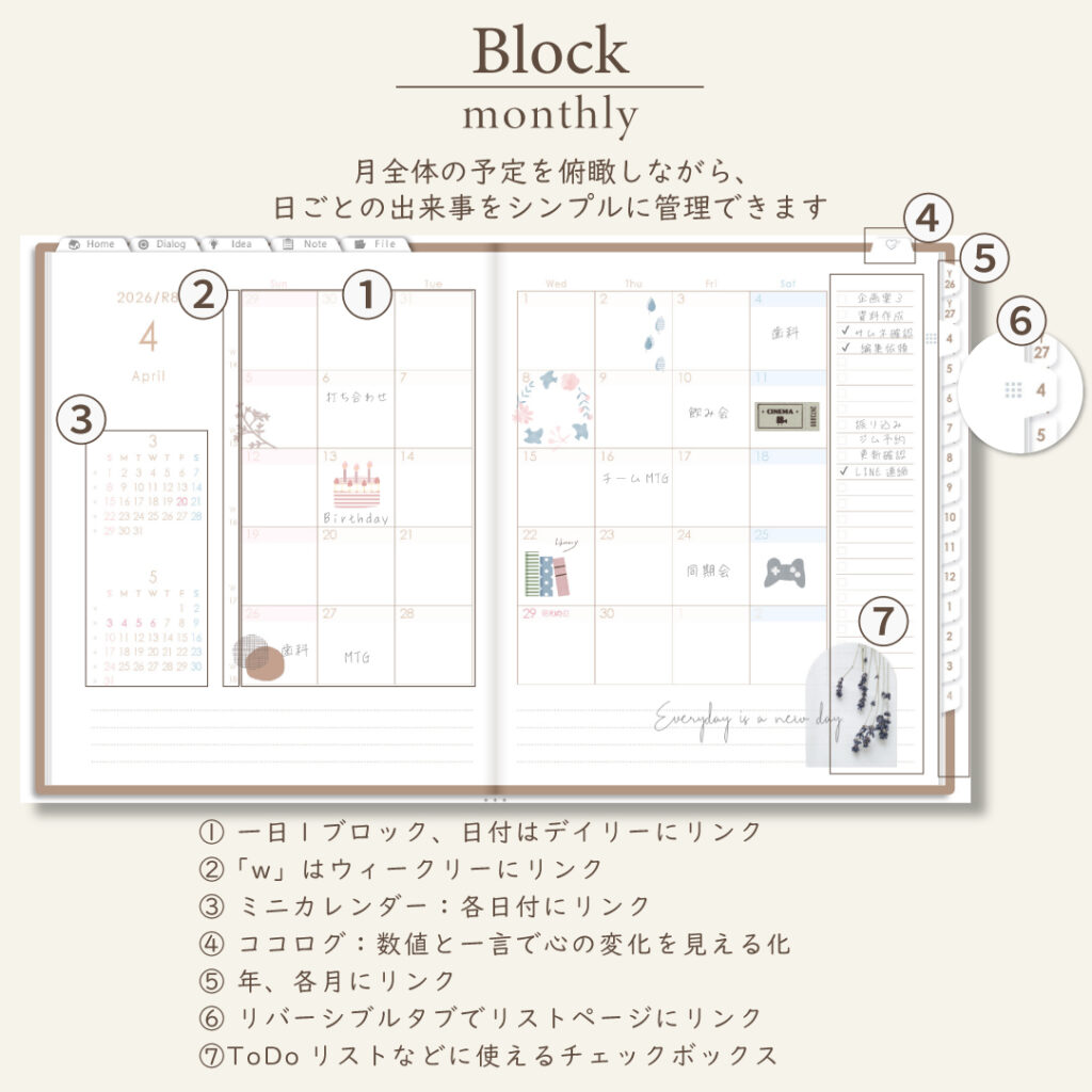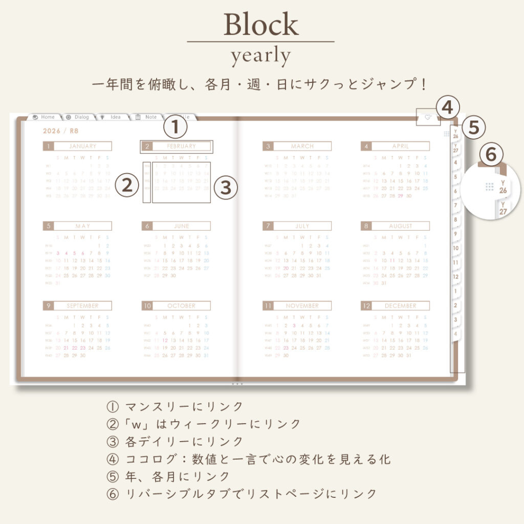- 年・月ページは「ブロック」と「リスト」がリバーシブル