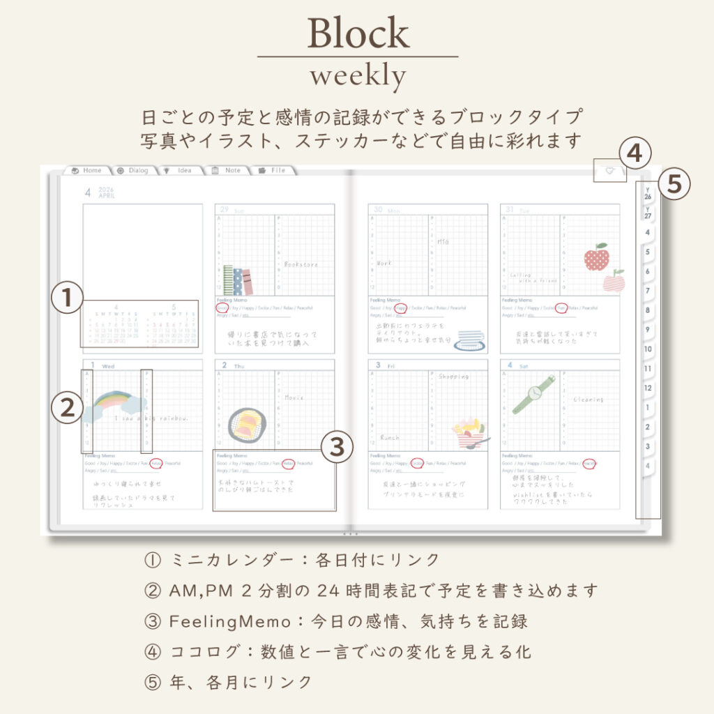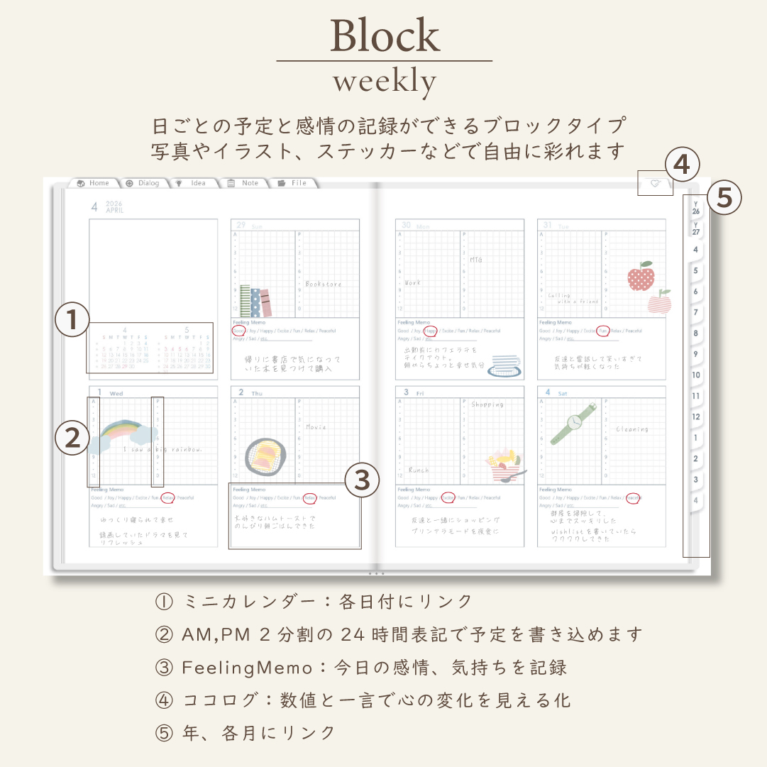 - 年・月ページは「ブロック」と「リスト」がリバーシブル