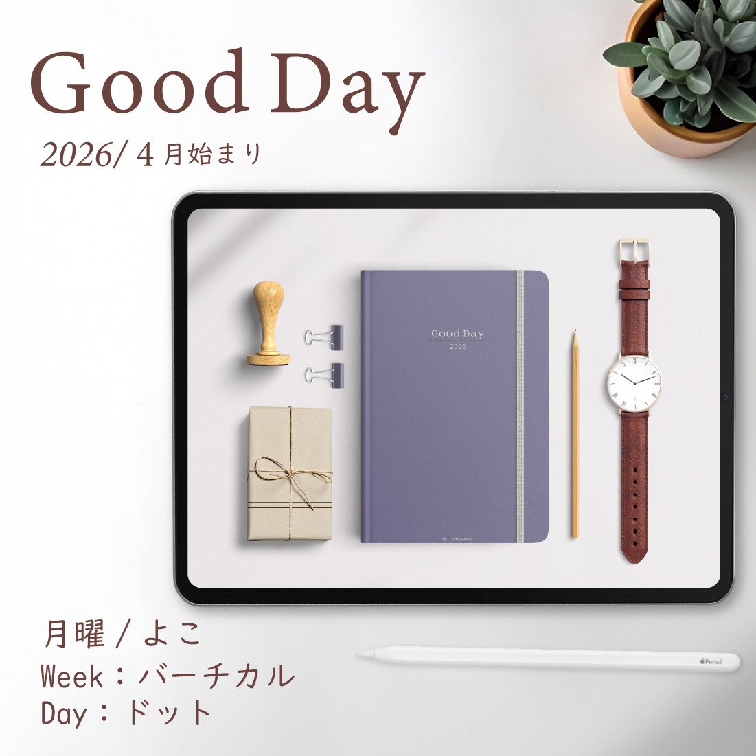 2026年4月始まり「Good Day」横タイプ[月曜始まり/週:バーチカル/日:ドット/色:スミレ]