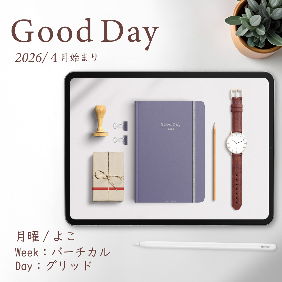 2026年4月始まり「Good Day」横タイプ[月曜始まり/週:バーチカル/日:グリッド/色:スミレ]