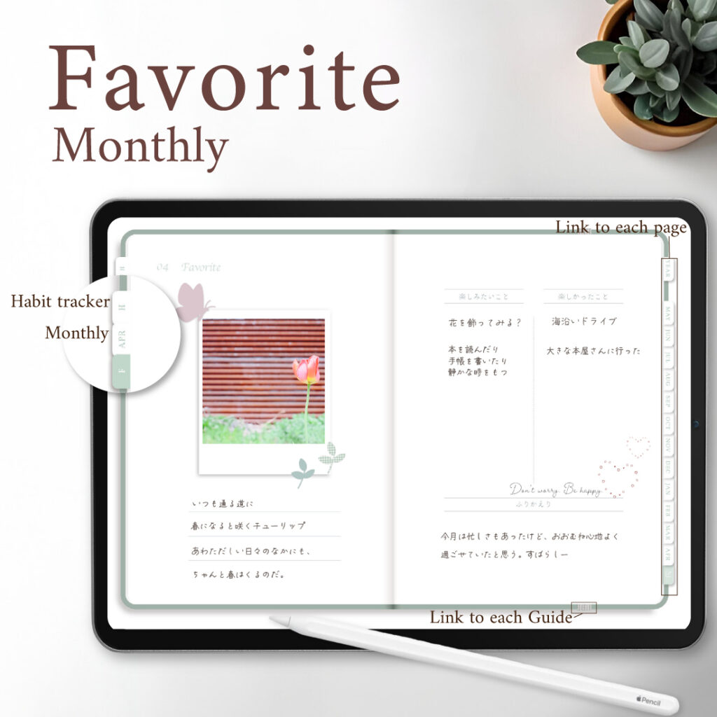 毎月の初めに「楽しみたいこと」、毎月のおわりに「楽しかったこと」、ふりかえりとお気に入りの写真を添えて