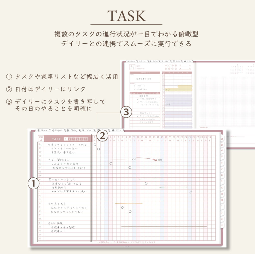 • スケジュールと連動したタスク&優先度シート