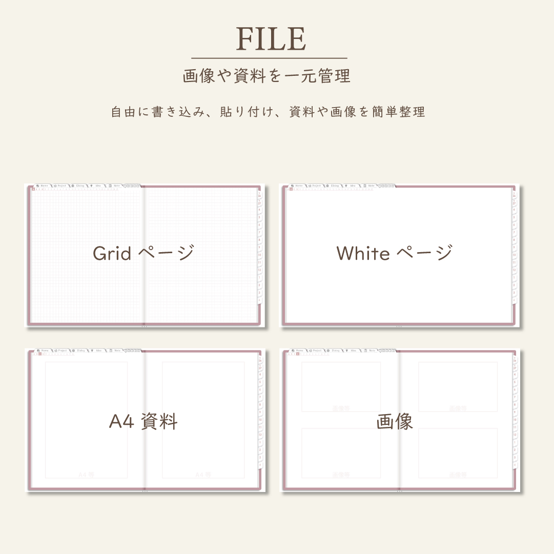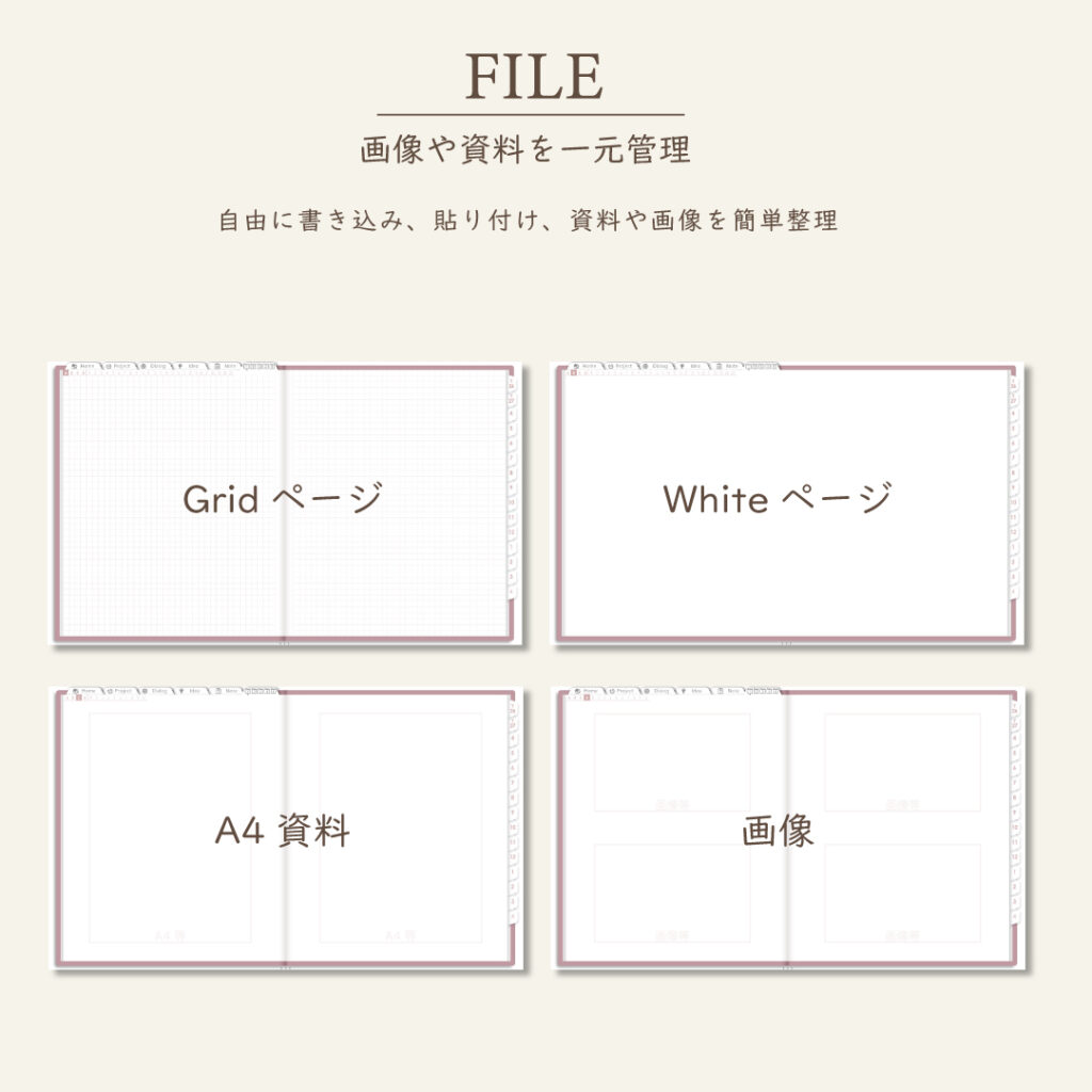 • 5種類×各100ページのノート、ファイルページ付き