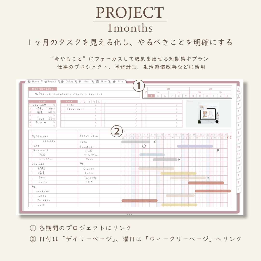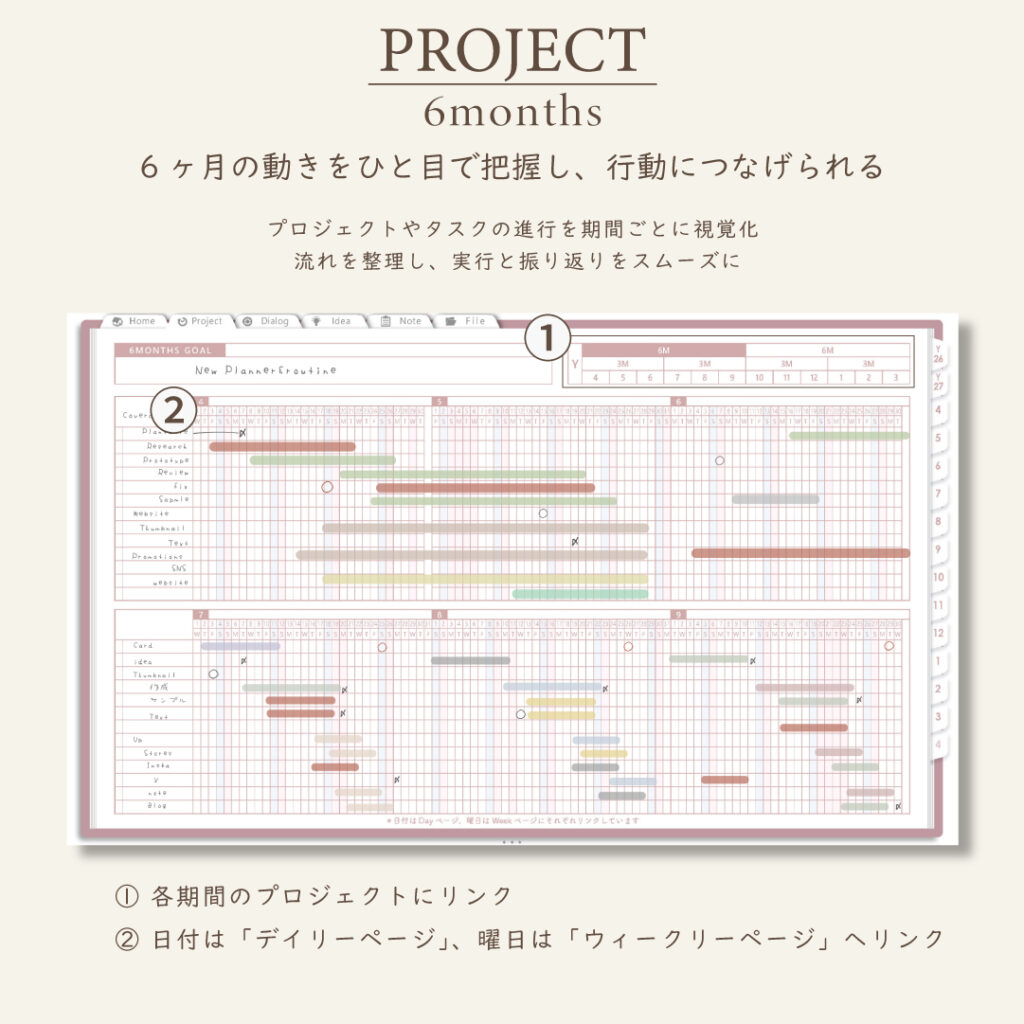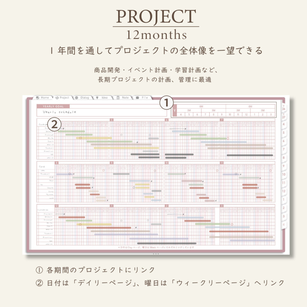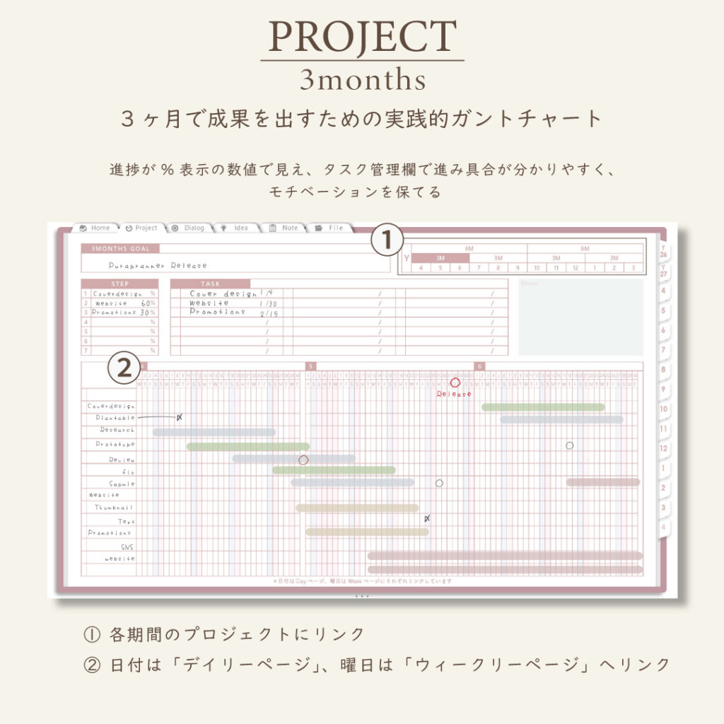• 1年・半年・3ヶ月・1ヶ月のガントチャートで進捗を見える化