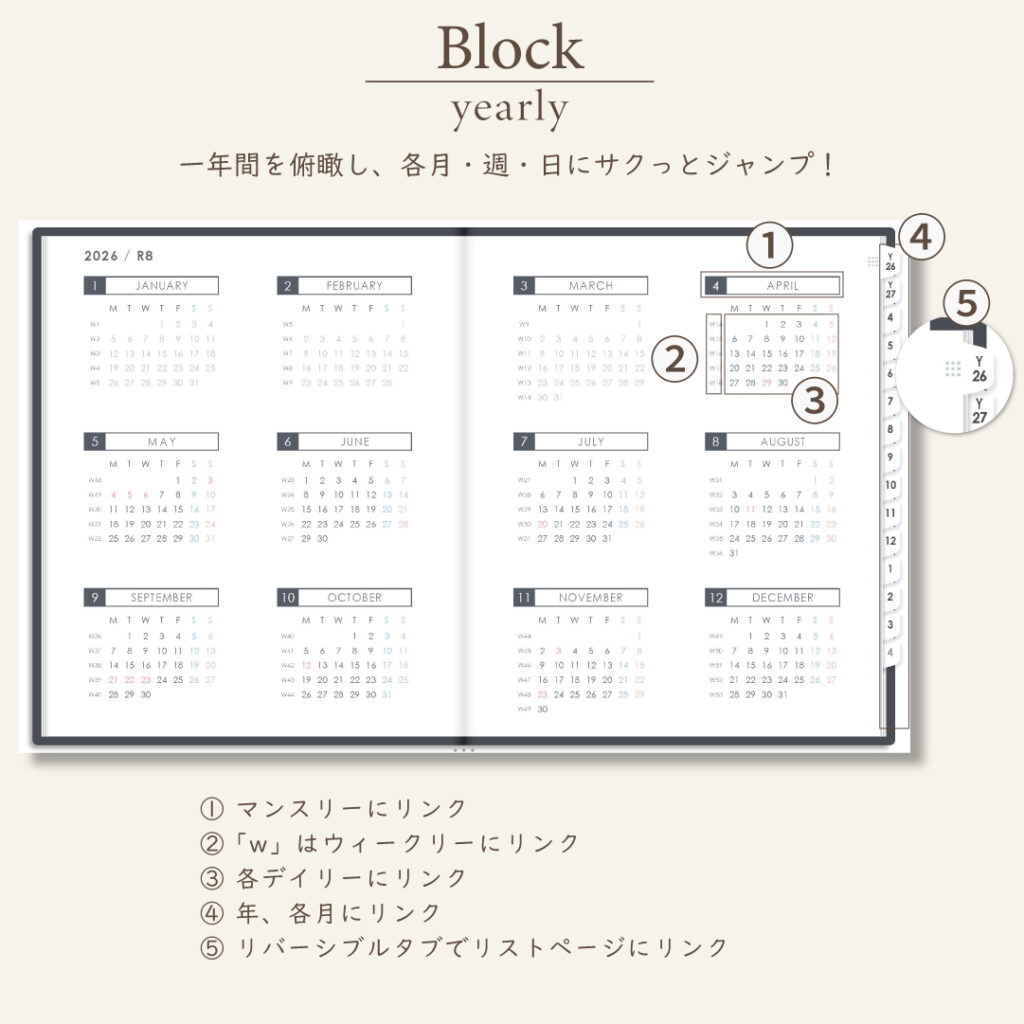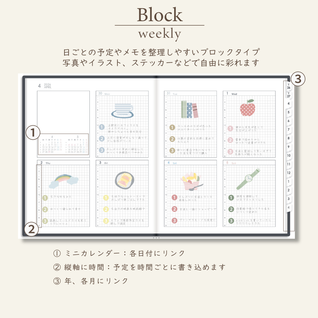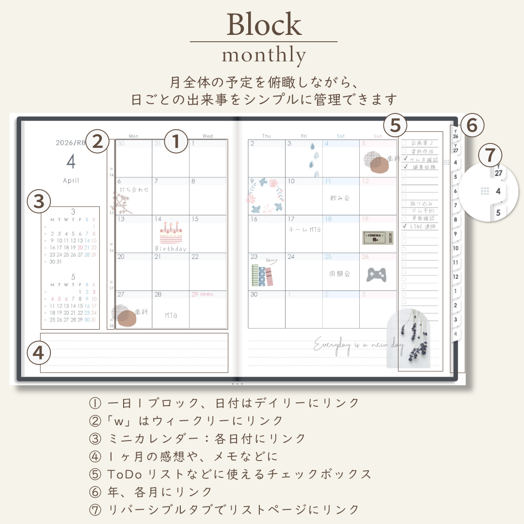 2026年4月始まりスケジュールプランナー[月曜始まり/週:ブロック/日:1DAY/色:モノ]