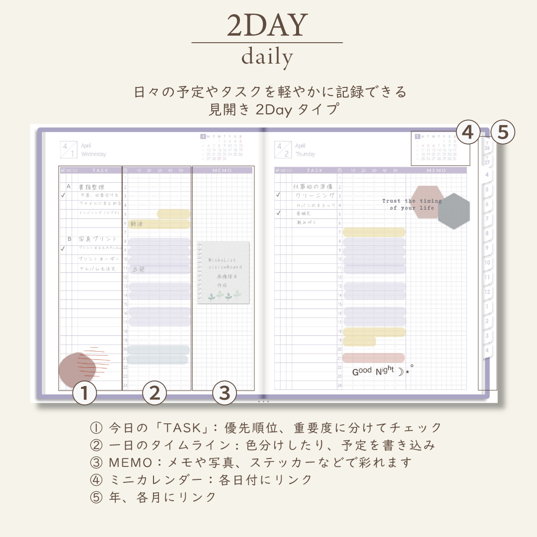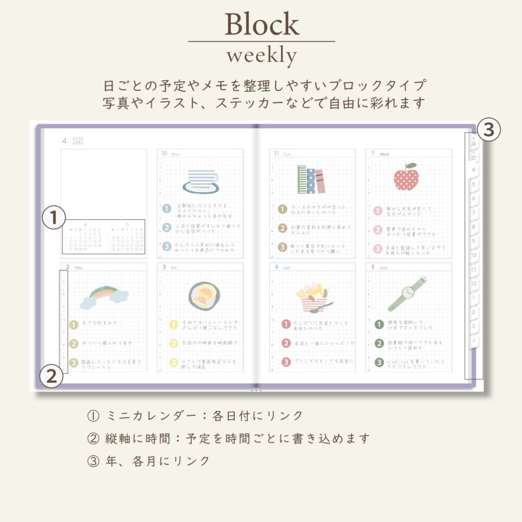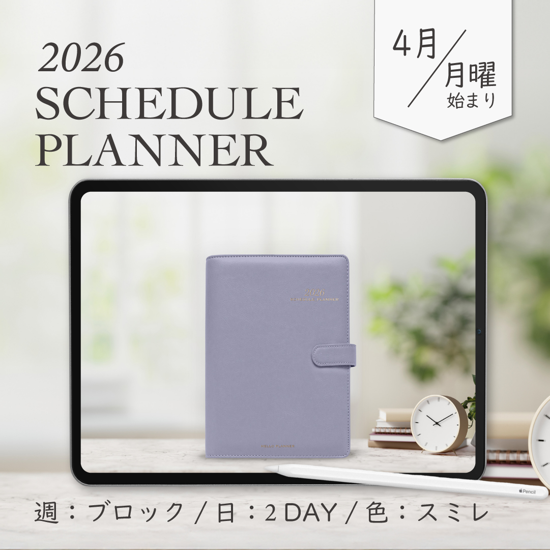 2026年4月始まりスケジュールプランナー[月曜始まり/週:ブロック/日:2DAY/色:スミレ]