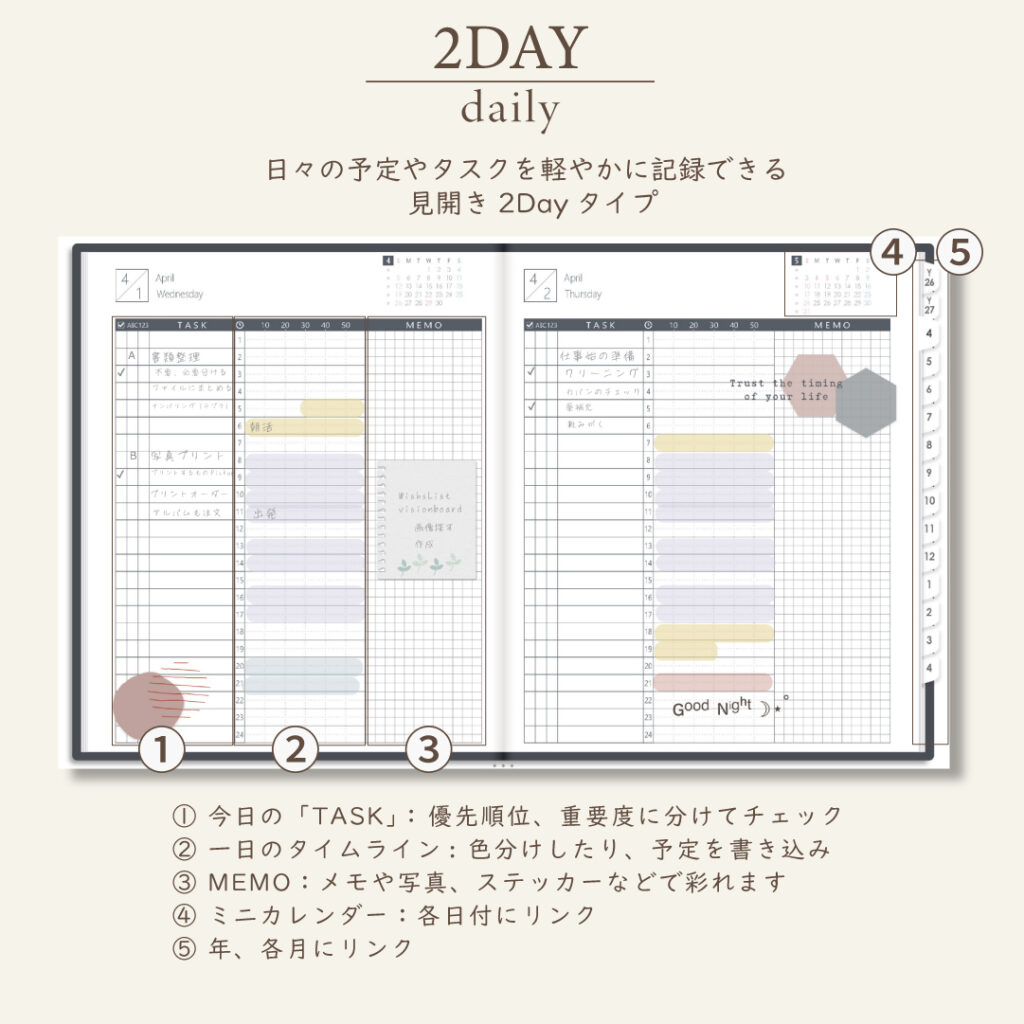 2026年4月始まりスケジュールプランナー[日曜始まり/週:バーチカル/日:2DAY/色:モノ]