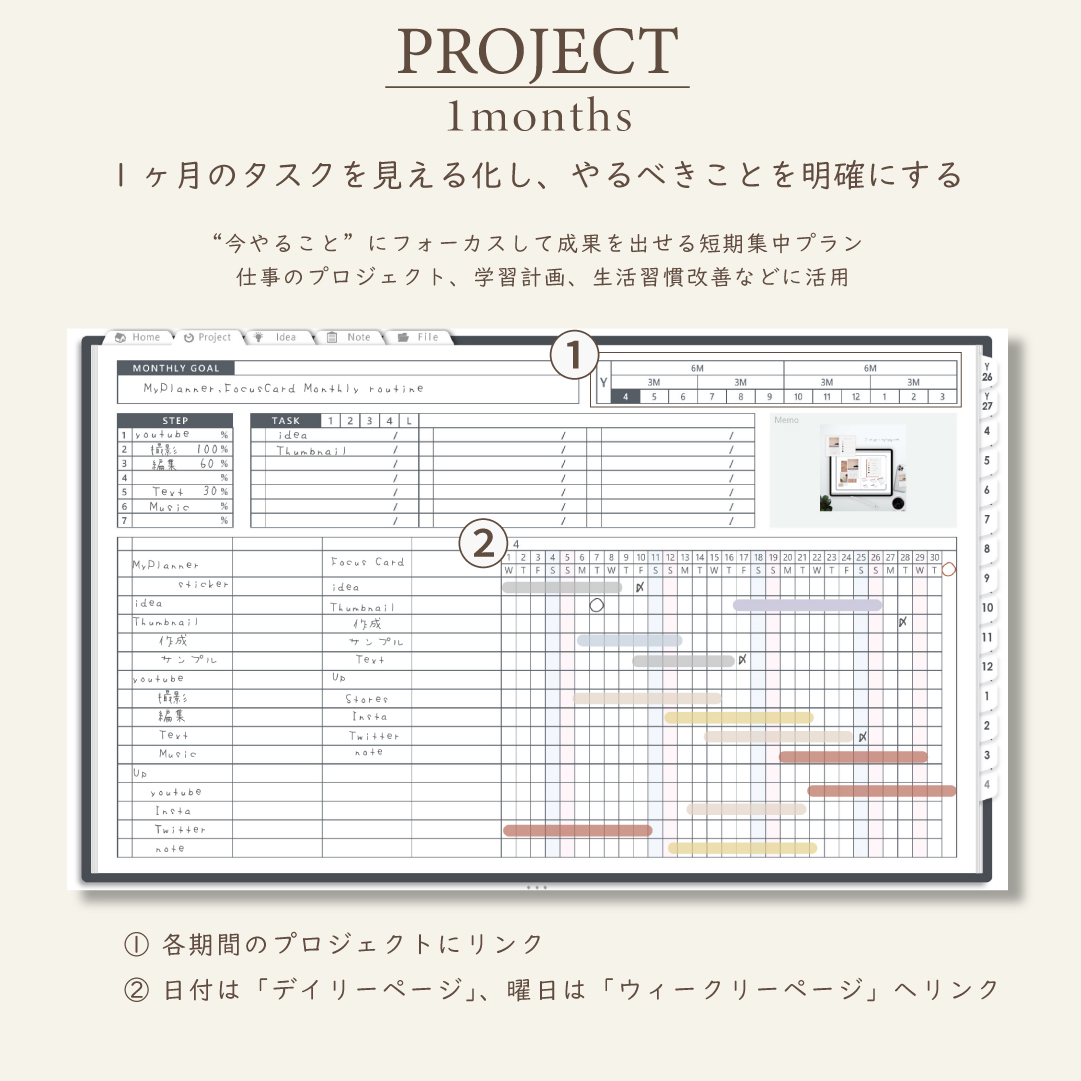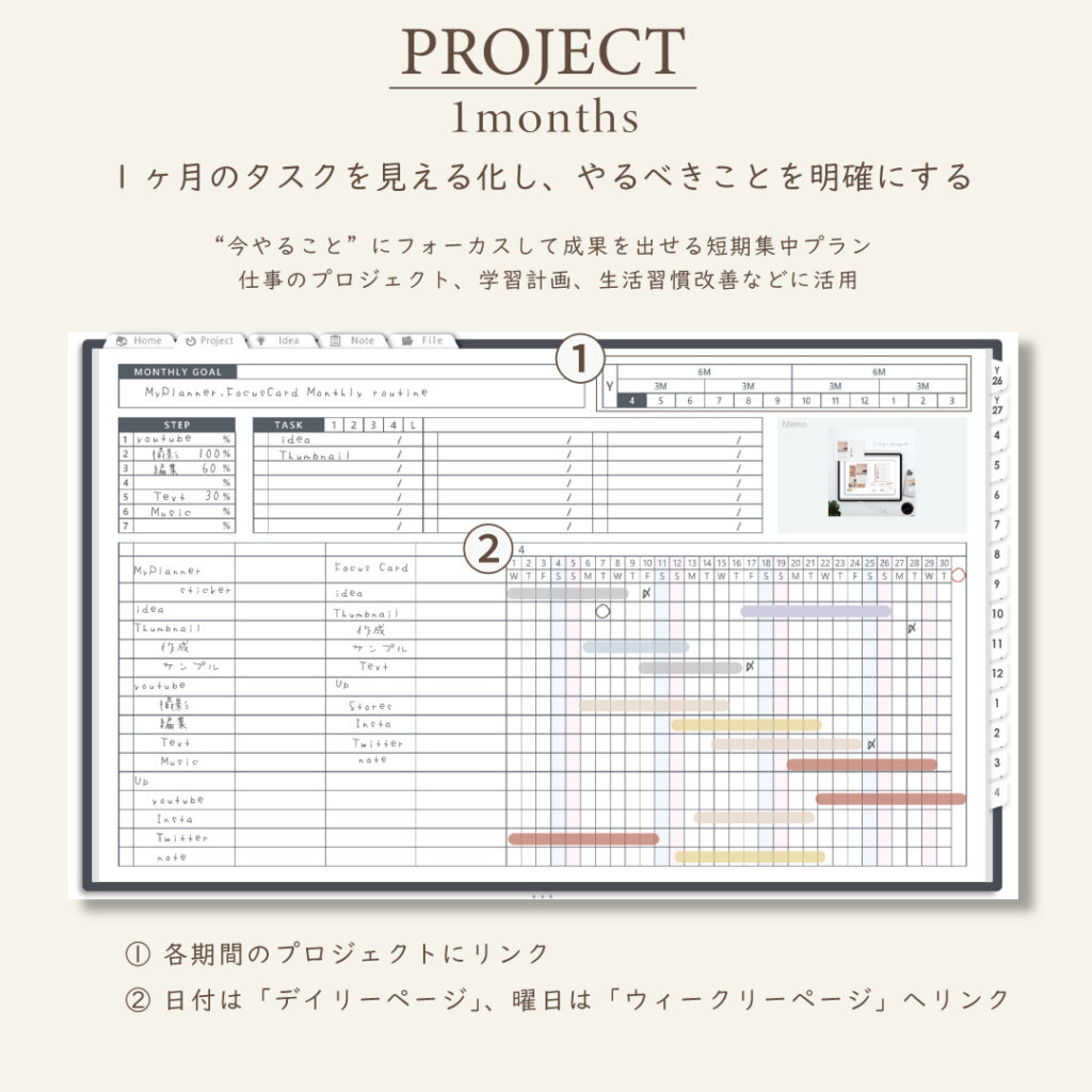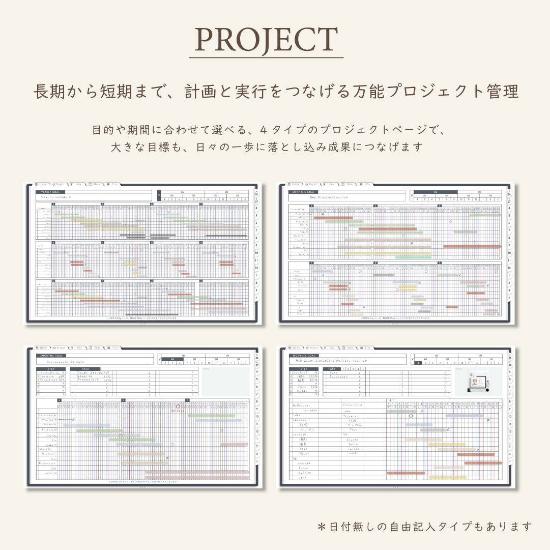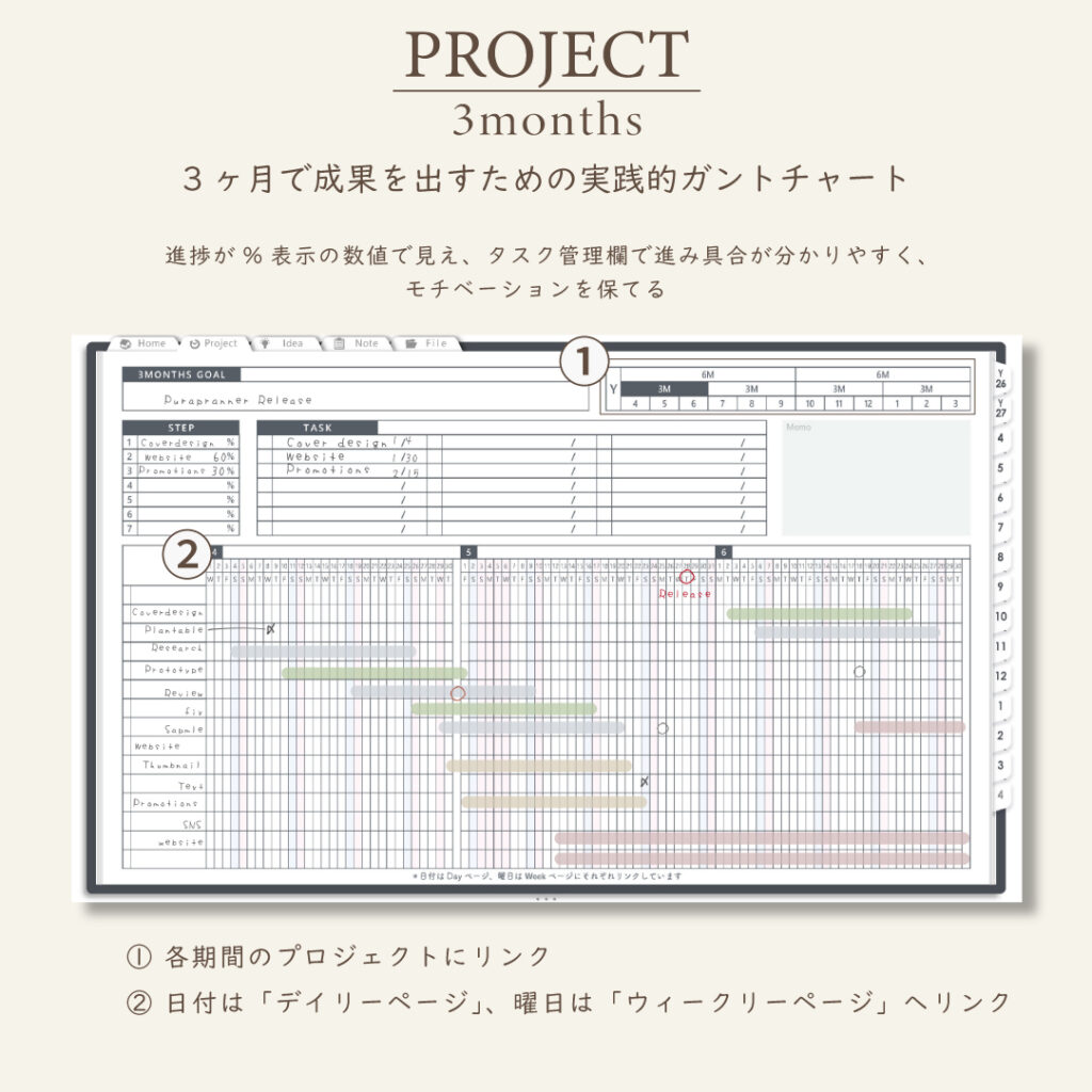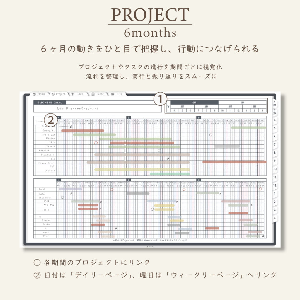 ・1年/半年/3ヶ月/1ヶ月を見渡せるガントチャート