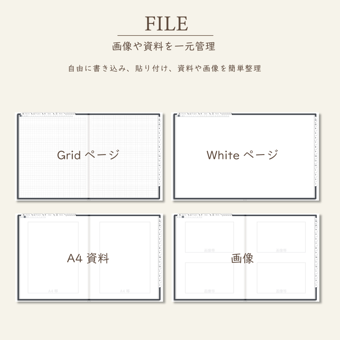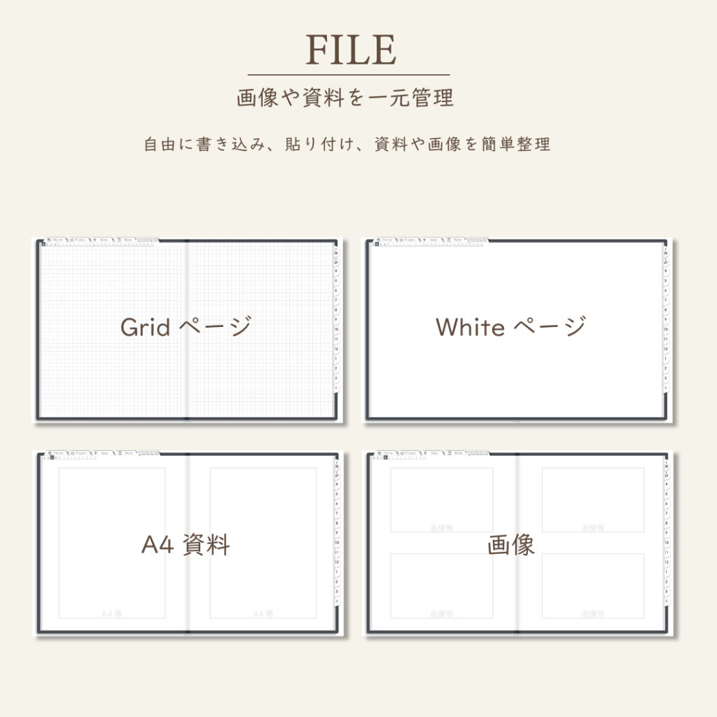 ・ファイル5種類×70Pで資料や画像も整理OK