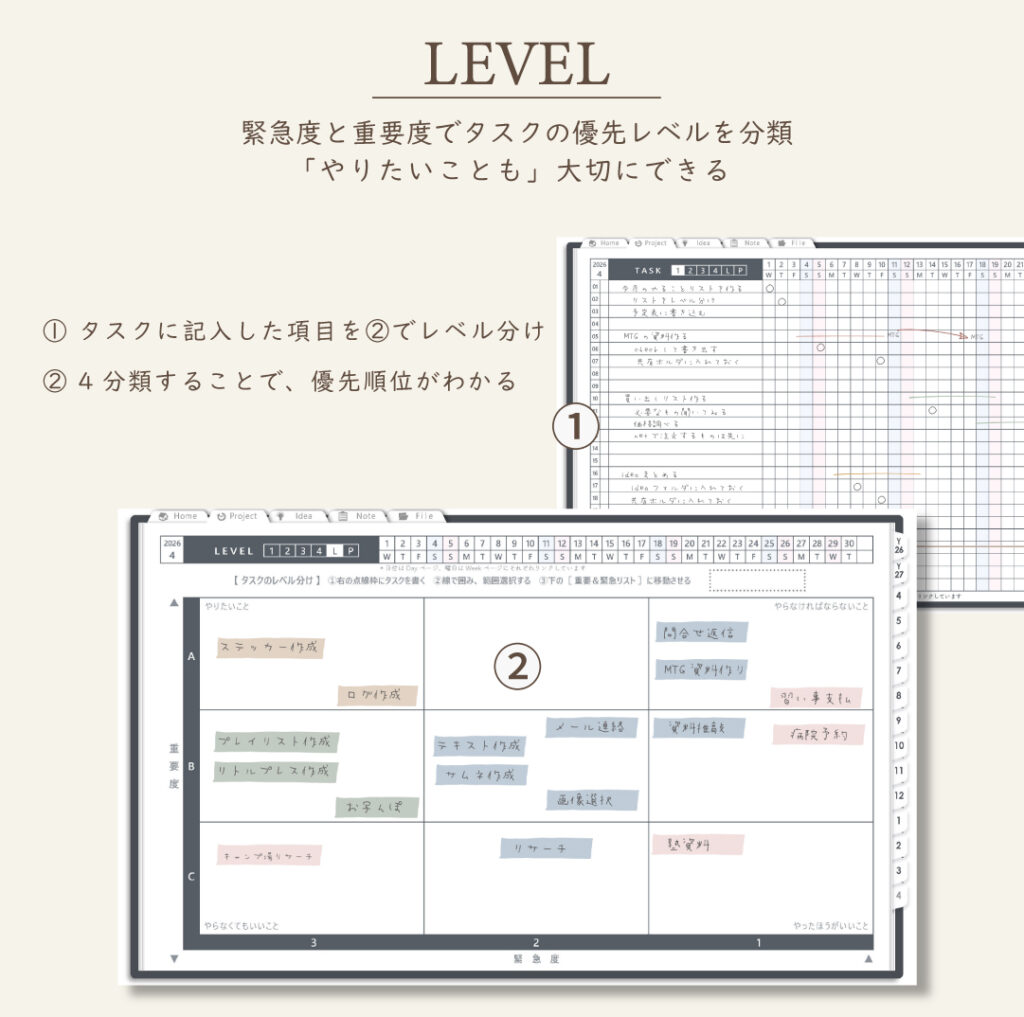 ・タスクを「重要度×優先度」で整理できるレベルシート