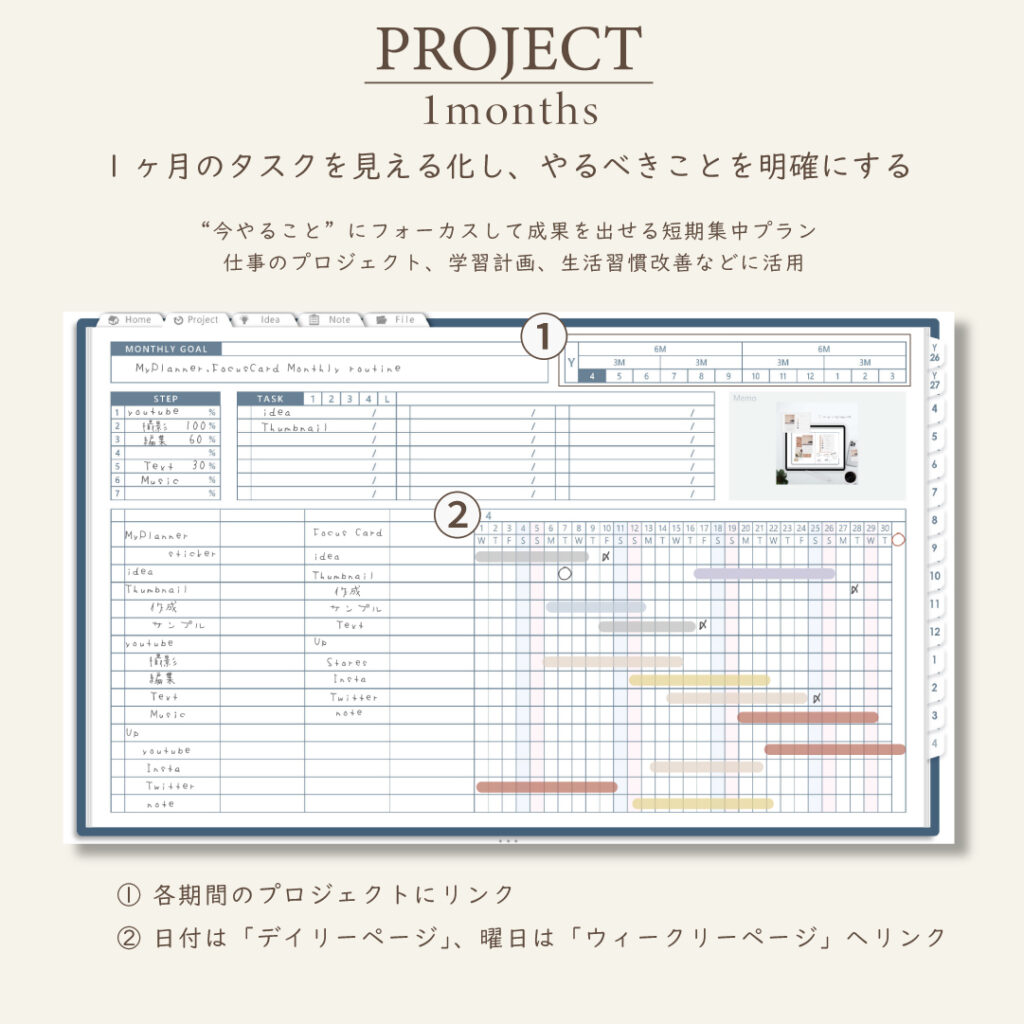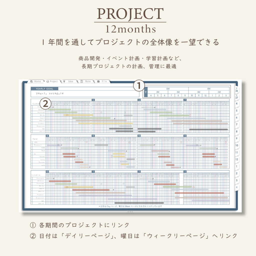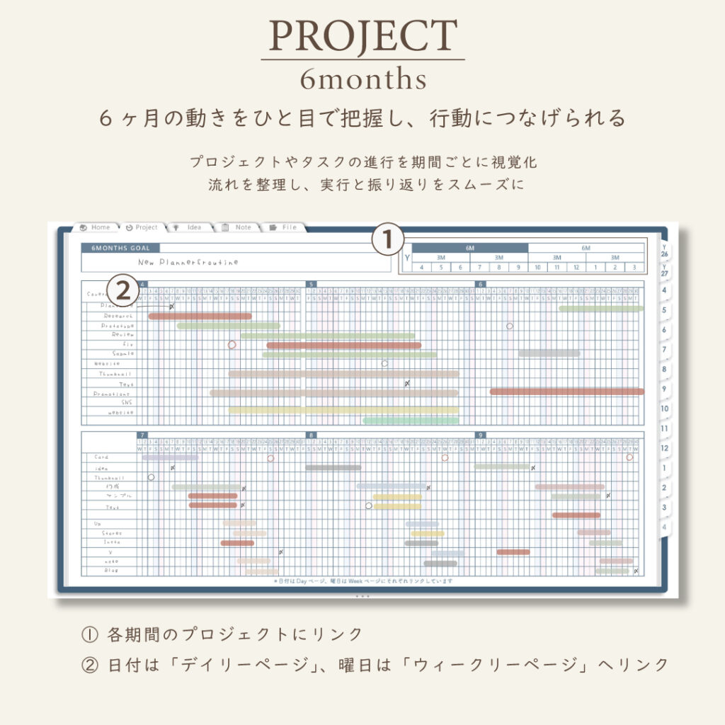 ・1年/半年/3ヶ月/1ヶ月を見渡せるガントチャート