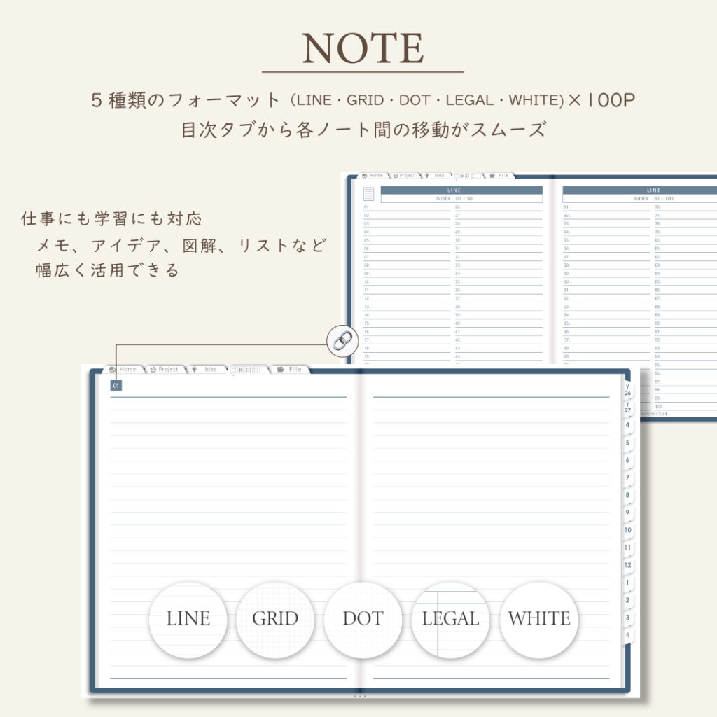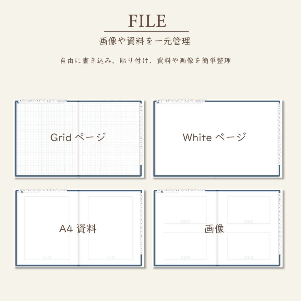 ・ファイル5種類×70Pで資料や画像も整理OK