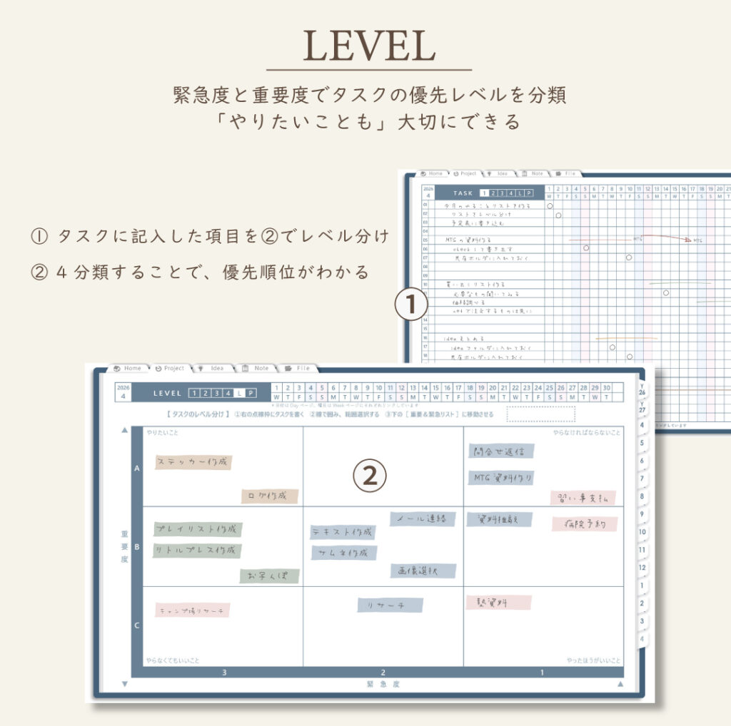 ・タスクを「重要度×優先度」で整理できるレベルシート