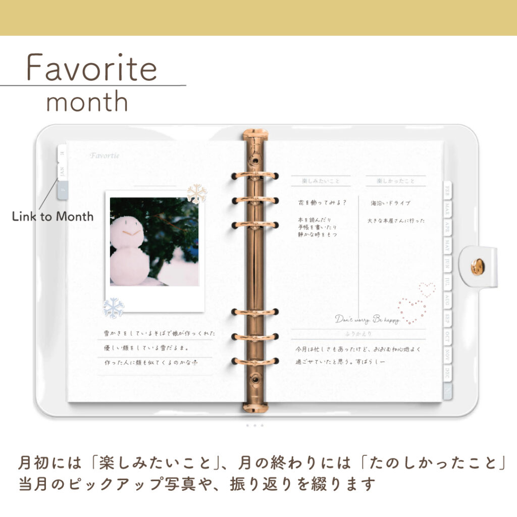 毎月の初めに「楽しみたいこと」、毎月のおわりに「楽しかったこと」、ふりかえりとお気に入りの写真を添えて