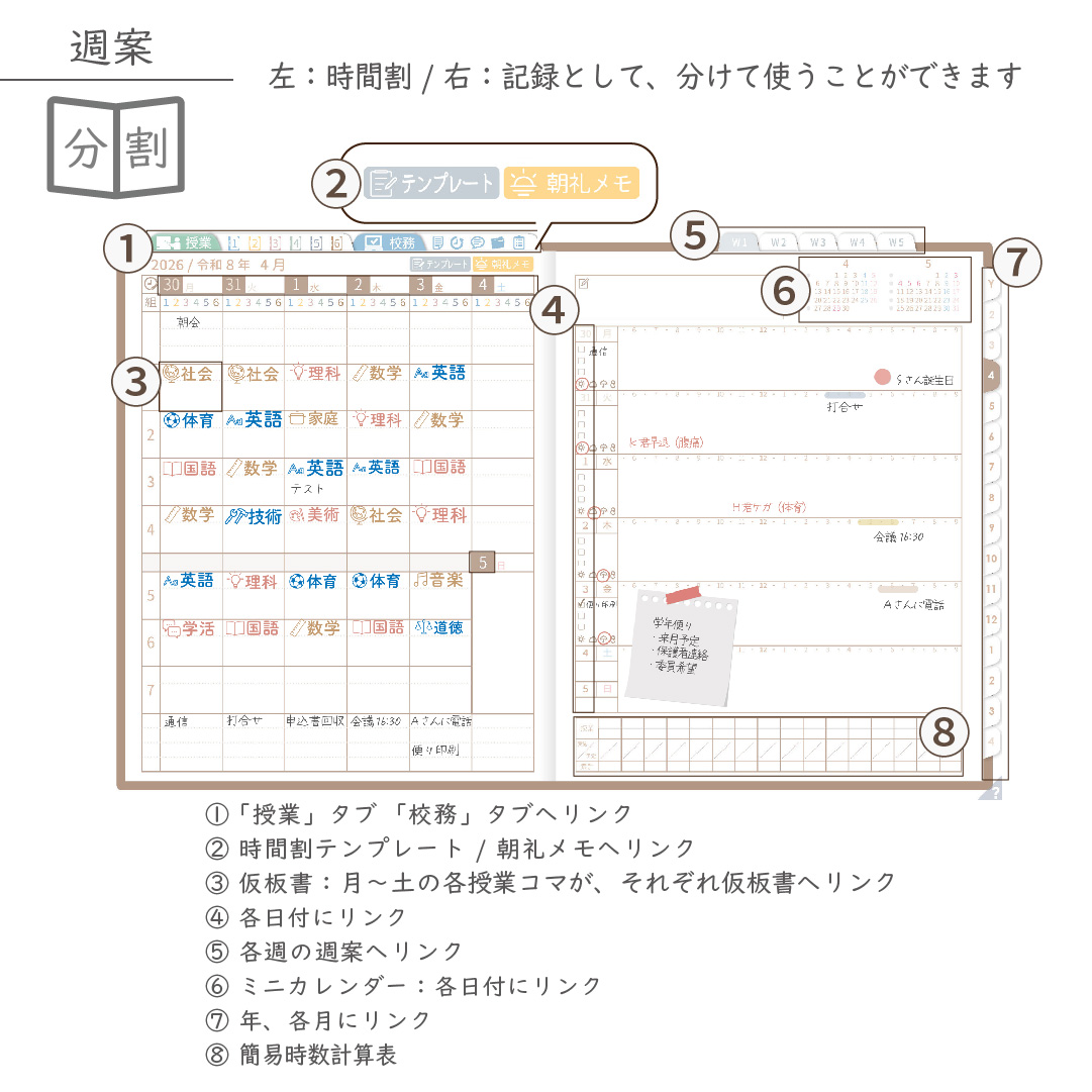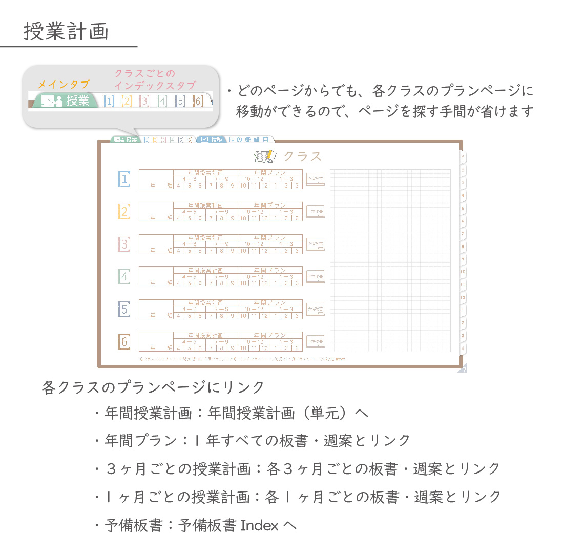 ・週案(※2)は3タイプから選べ、板書ページがリンクで直ぐに開けます