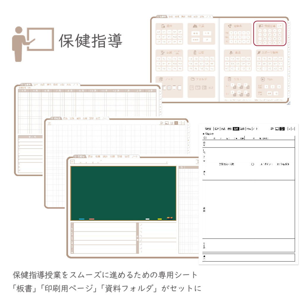 スケジュール管理だけでなく、保健指導、生徒対応、来室・相談記録、各種書類管理など、多岐にわたります。