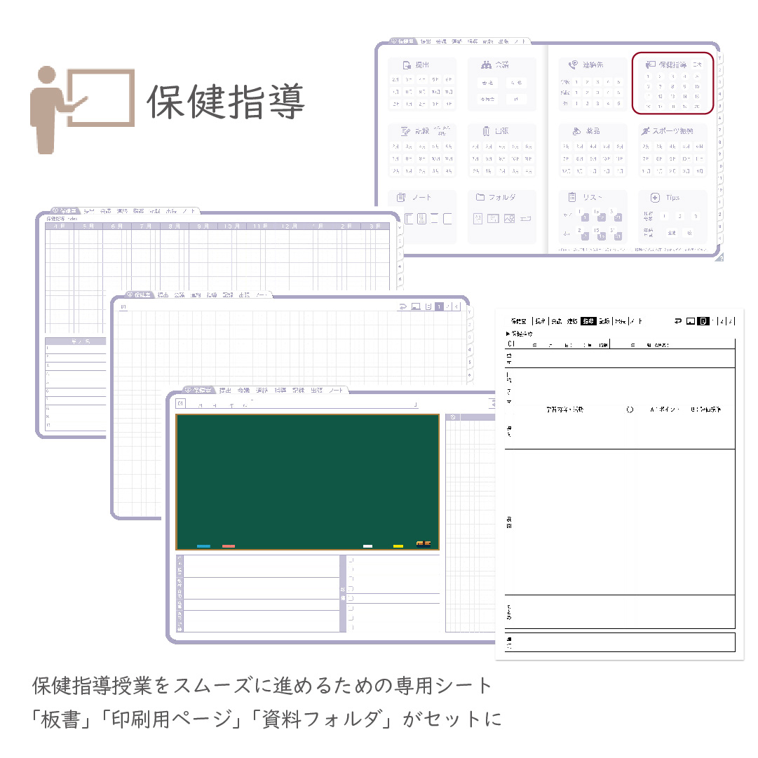 スケジュール管理だけでなく、保健指導、生徒対応、来室・相談記録、各種書類管理など、多岐にわたります。